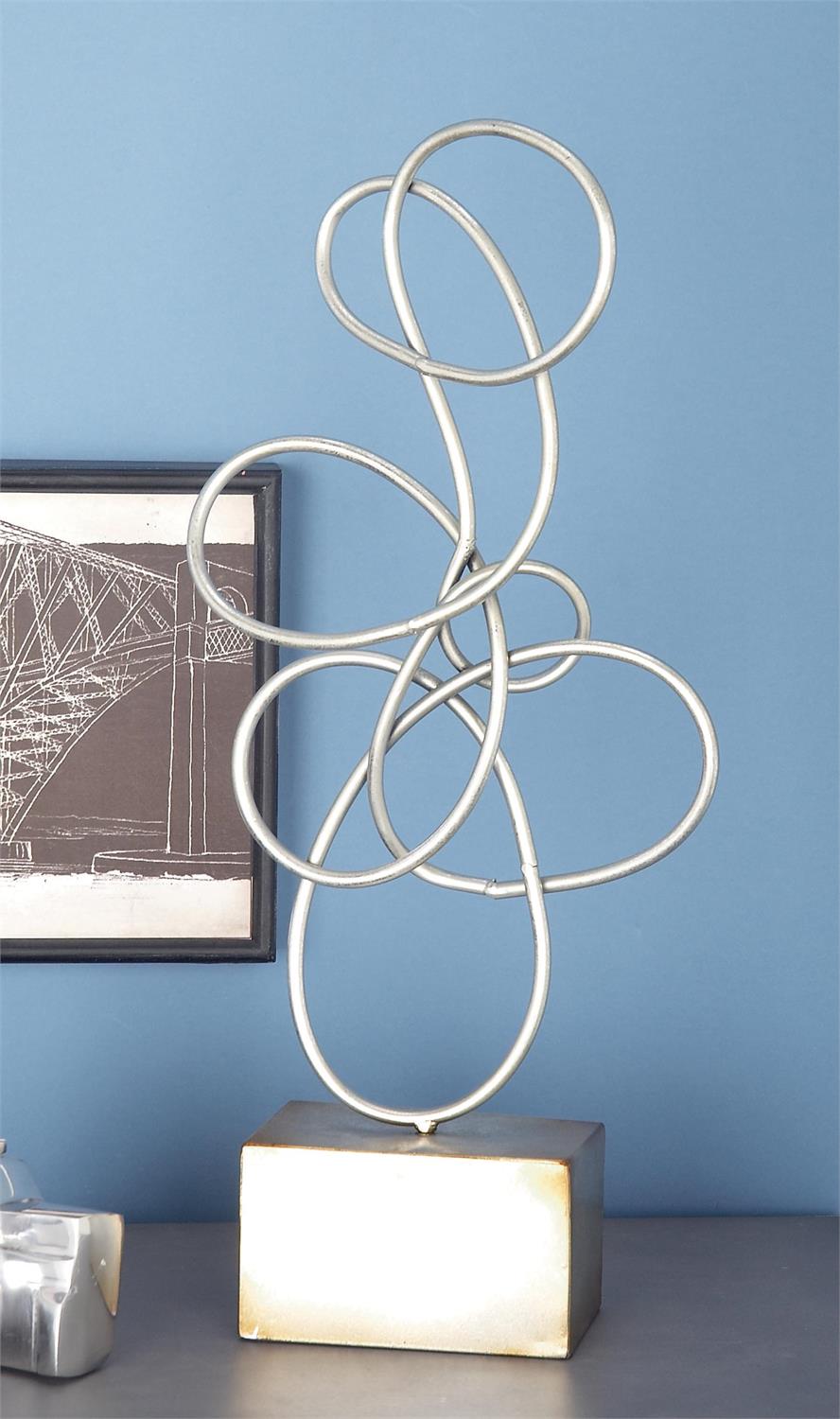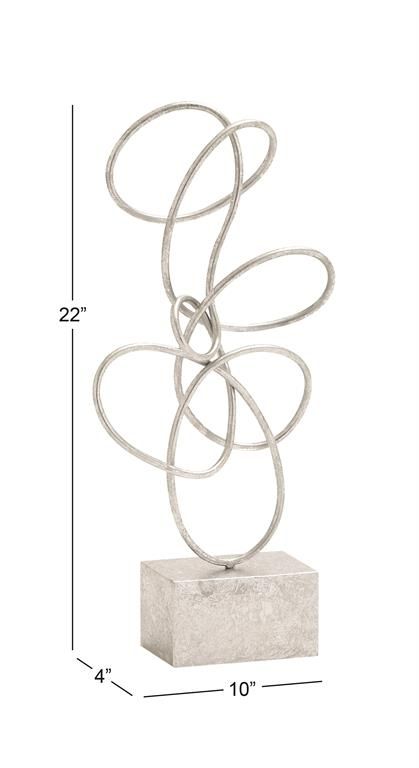 Embrace artistic expression with a style that highlights bold designs with sleek lines, neutral elements, and a minimalist aesthetic. Silver decorative sculpture is crafted from solid iron, ensuring durable construction. The metallic satin silver finish over the smooth loop of this abstract decorative statue brings elegance to any space. The iron sculpture features a sleek metallic finish, smooth loops, and a secure base with gold accents around its edges and corners.