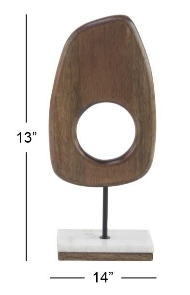 Inspired by sleek elegance and clean lines, a minimalistic design offers effortless luxury with monochromatic tones and bold, angular structures. Brown decorative sculpture is skillfully crafted from a harmonious blend of luxurious marble, robust iron, and rich mango wood, creating a timeless piece. Oval decorative statue is boasts warm oiled golden-brown finishh on the wood ring, complemented by a black metal post and white marble with subtle light gray veining. Mango wood sculpture features a brown wooded abstract cut-out in a black metal stand with a white marble base, elevating the aesthetic of any room.
