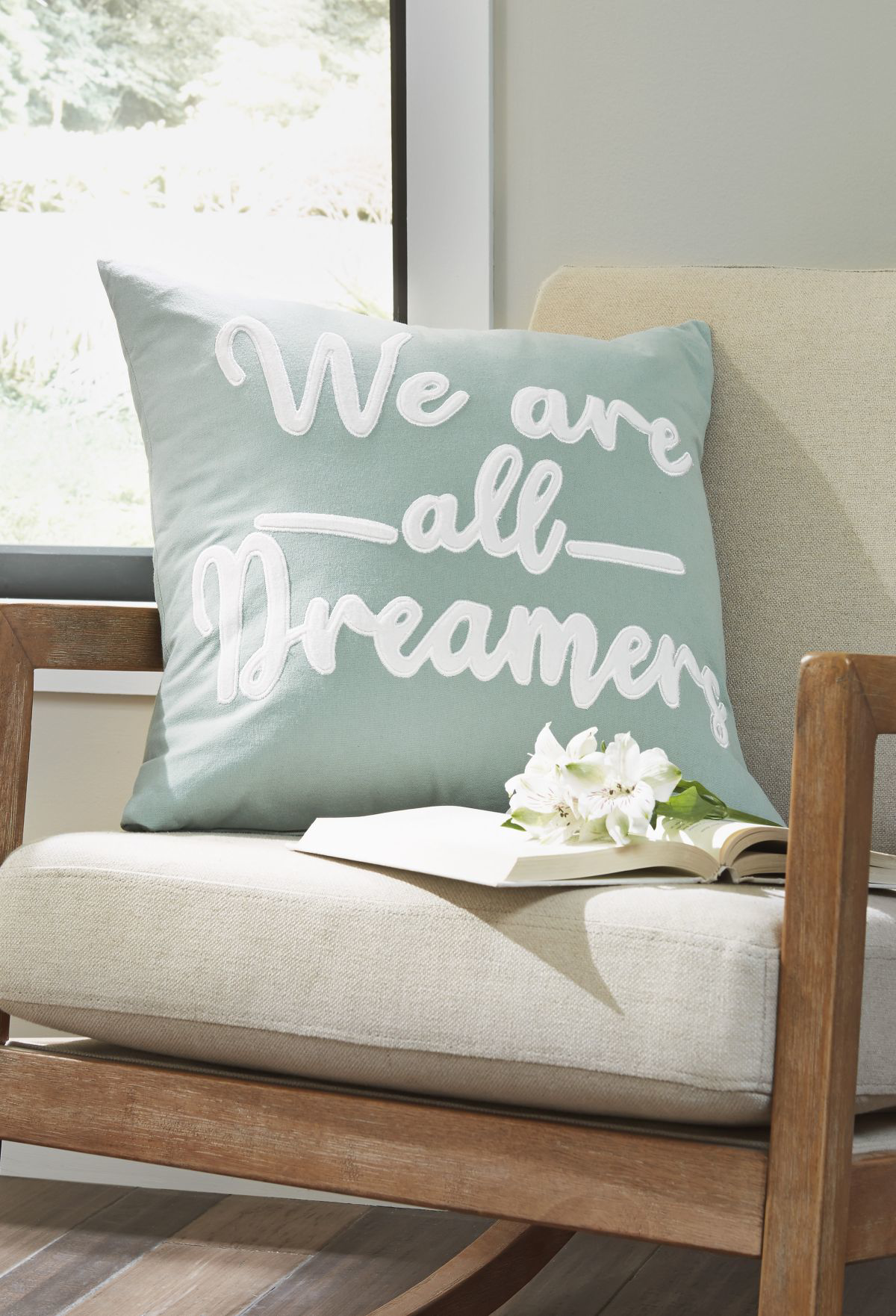 This inspirational quote pillow with velvet applique in slate blue and white is sure to inspire with a positive vibe. Send a motivational message with this pillow.