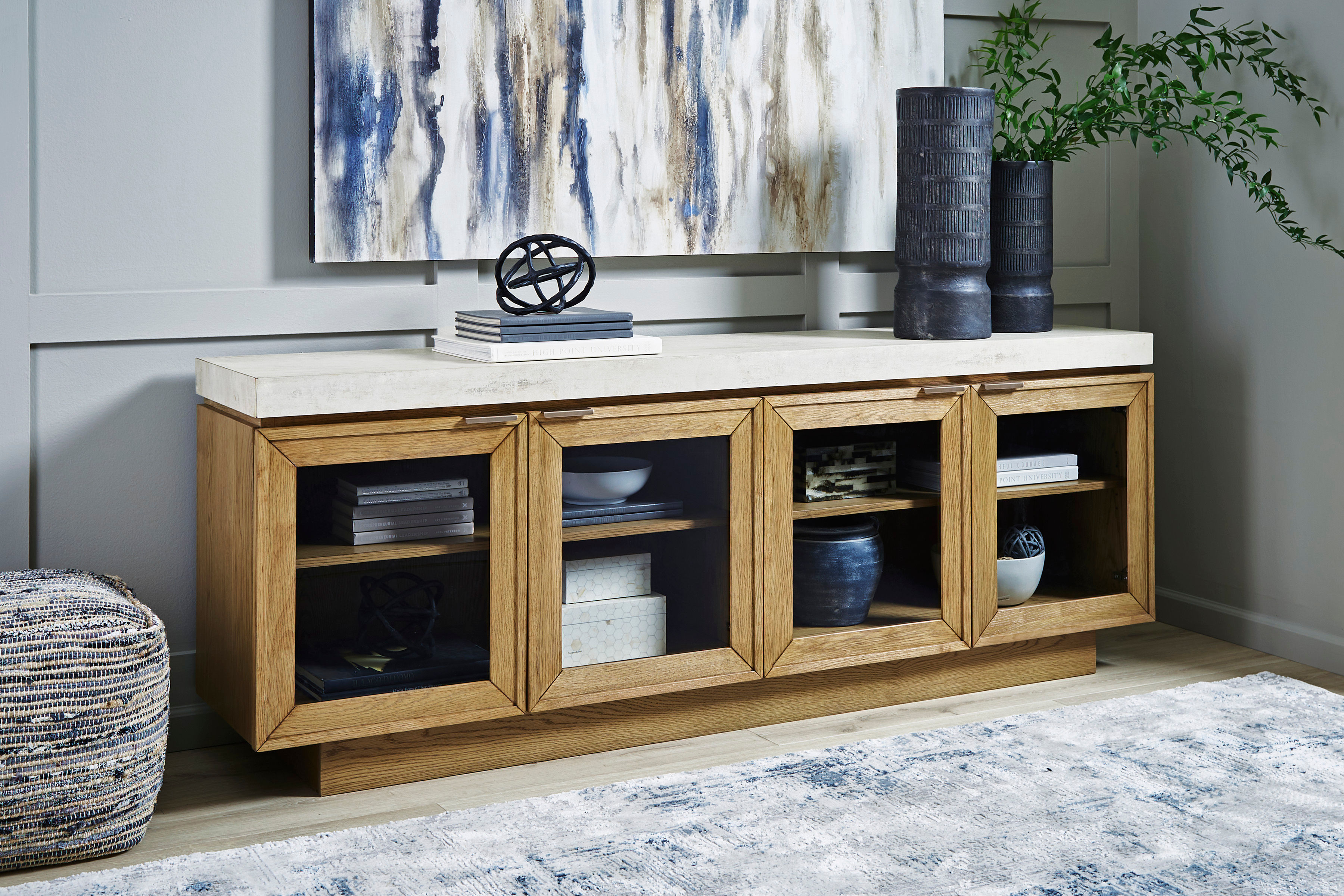 Curate a home that captures your knack for dynamic design. Merging the look of oak with faux concrete, this accent cabinet casts a decidedly contemporary vibe in your living space, dining area or entryway. Soft-close doors with glass inserts and two adjustable shelves give the piece a layer of fabulous function.