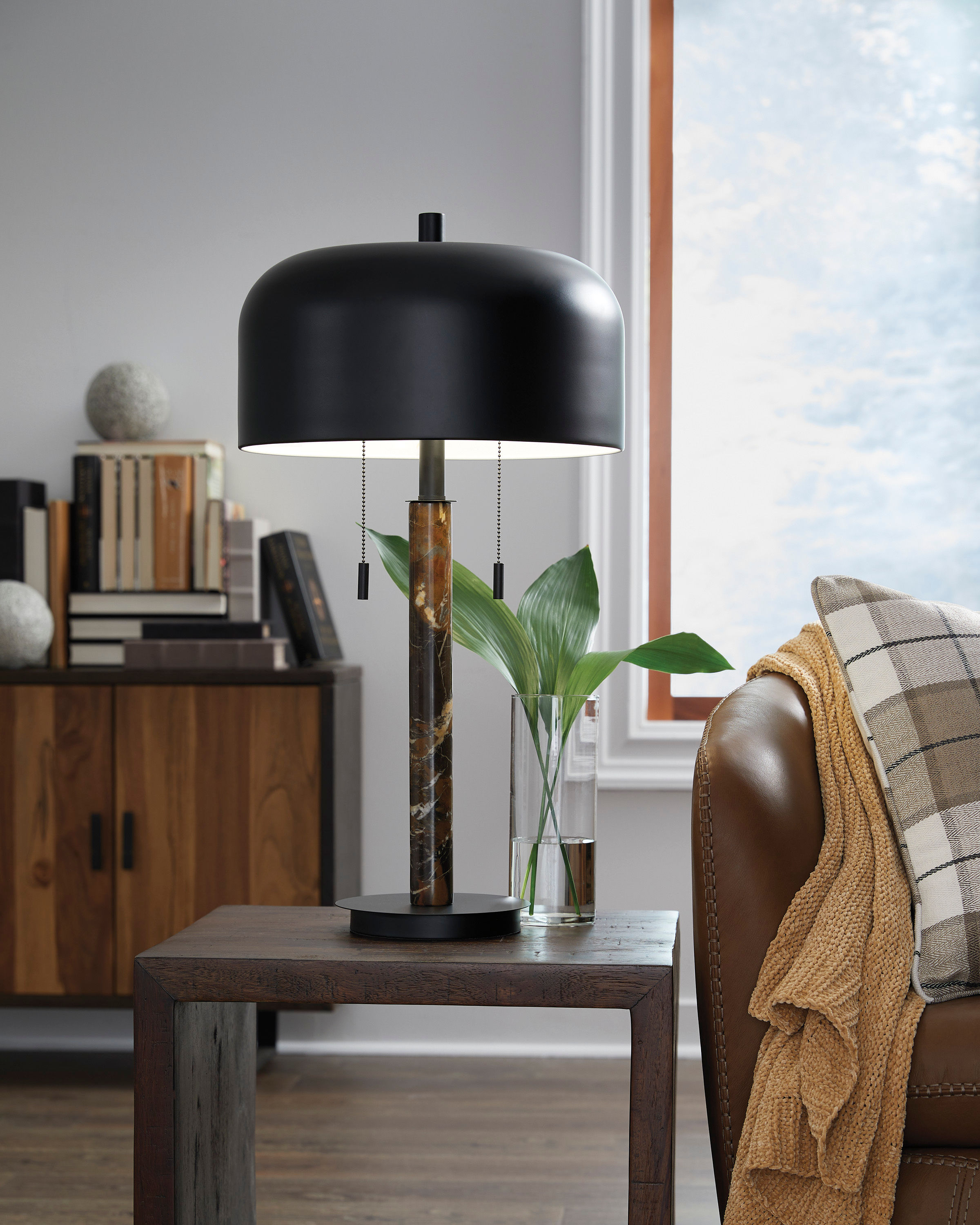 Add a sleek design to your home with the Alanbert table lamp, made from dark brown marble and metal with a black finish. Featuring an on-off pull-chain switch for ease and a metal dome shade, this table lamp has endless contemporary style. Due to the use of natural materials, some variations may occur.