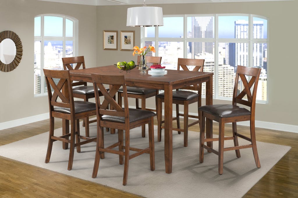 Bring a tasteful dining setting to your home with this counter height transitional table and chair set. The table features a rich finish and clean lines, while the chairs feature X-backs and faux leather upholstered seats for effortless comfort and style. Your friends and family are sure to love gathering here for quality meals and conversation.