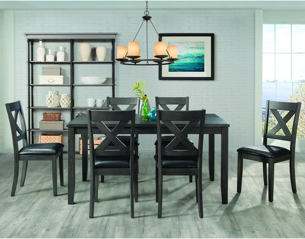 The Alex grey dining set is the perfect new addition to your dining room. The rectangular table shape will easily fit into any dining space. The chairs feature an X-back design and the seats are upholstered in a faux leather fabric; adding some extra flair to this set. The foam cushion seats will keep you comfortable during long dinners or game nights. The set is finished in a dark grey, pairing perfectly with the black, faux leather upholstery on the chair seats.
