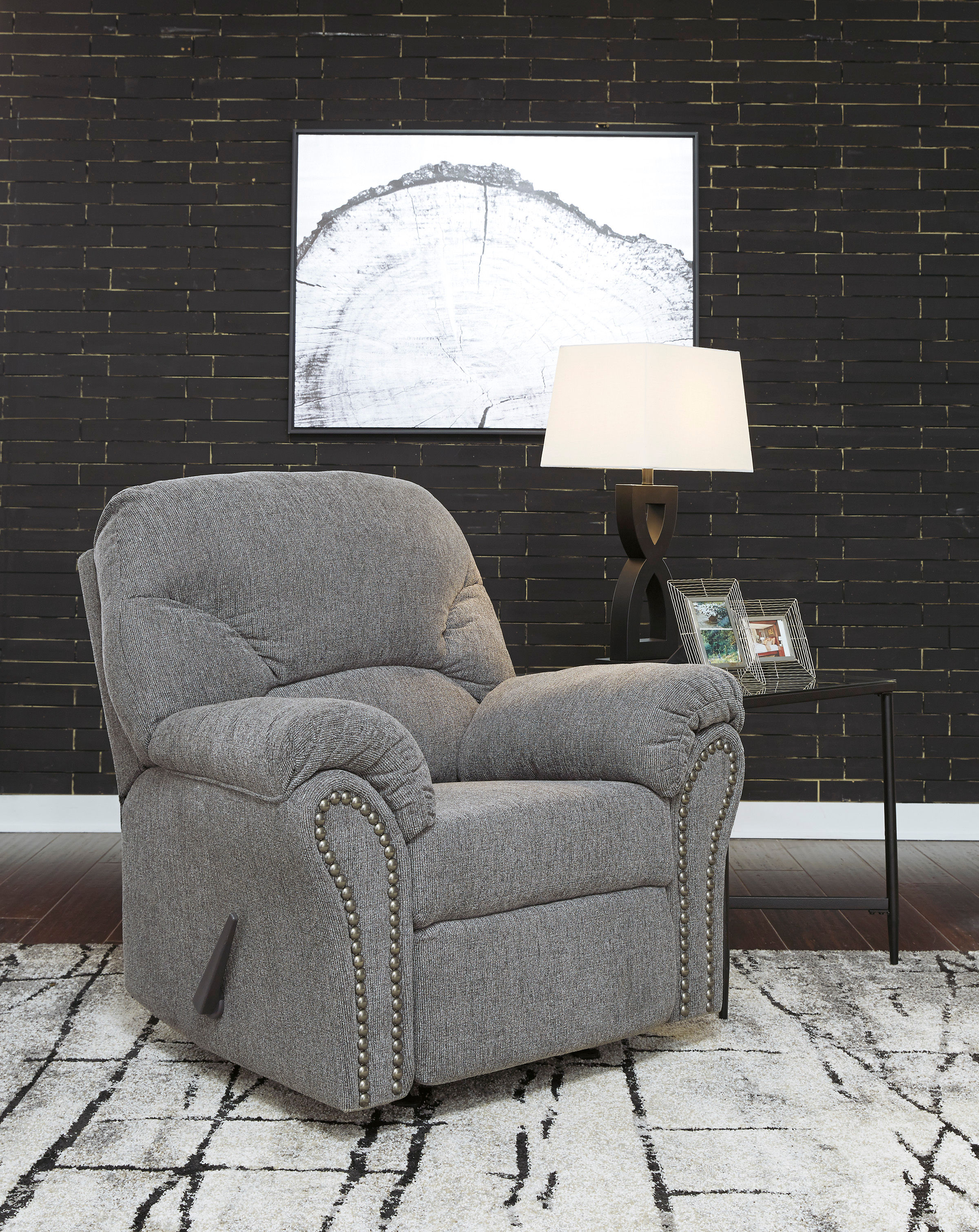 Why sacrifice comfort for style (or style for comfort) when you can have the best of both in this rocker recliner in pewter gray. Elements include a chic divided-back design and pillow top wrapped armrests that make nodding off all too easy. Calling attention to the elegantly flared armrests—black nickel nailhead trim for a punch of cool character.