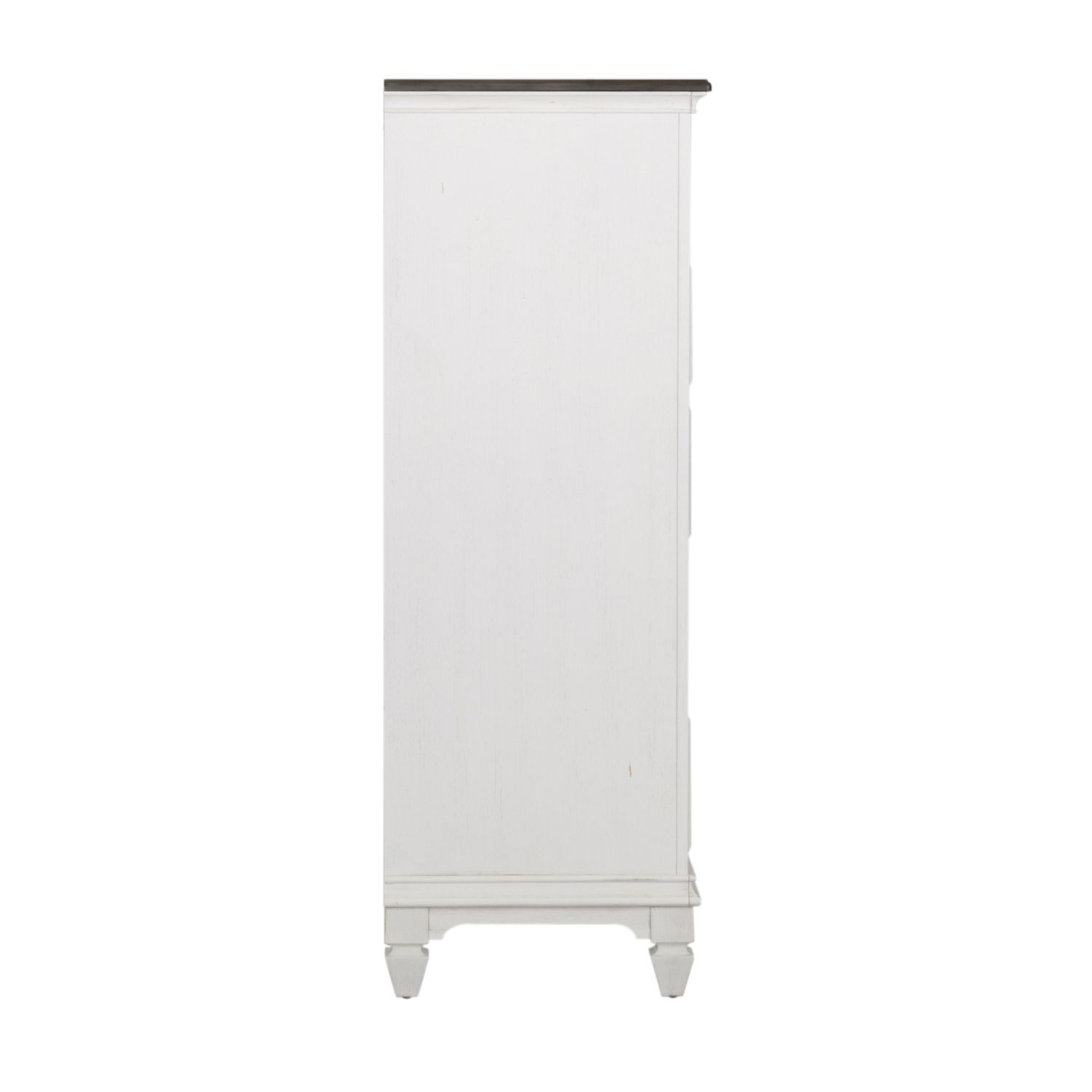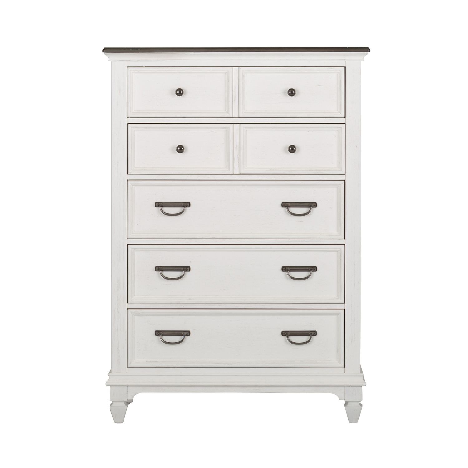 Enhance your room with the Allyson Park chest. Crafted with pine solids and veneers with cathedral white oak tops, this piece features felt lined top drawers, fully stained interior drawers, beautiful bead molding, and is anchored by tapered feet. The two-toned wire brush finish with charcoal tops paired with the antique pewter knob and drop bail hardware designs a look that is versatile and would look good in any home, from a beach house to a big city loft.