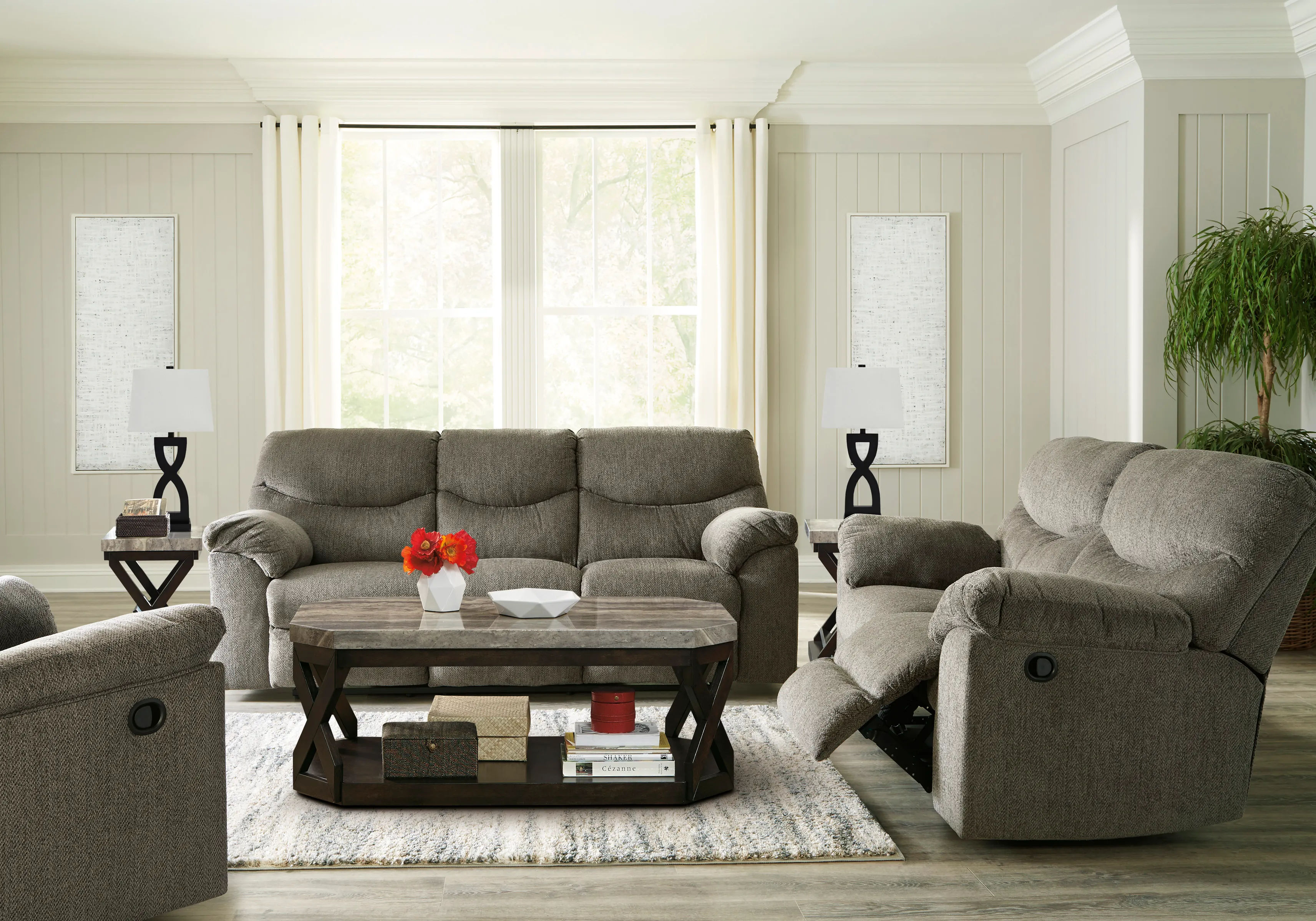 This reclining sofa has a sincere style with pull-tab reclining and high-quality functionality at an affordable price.