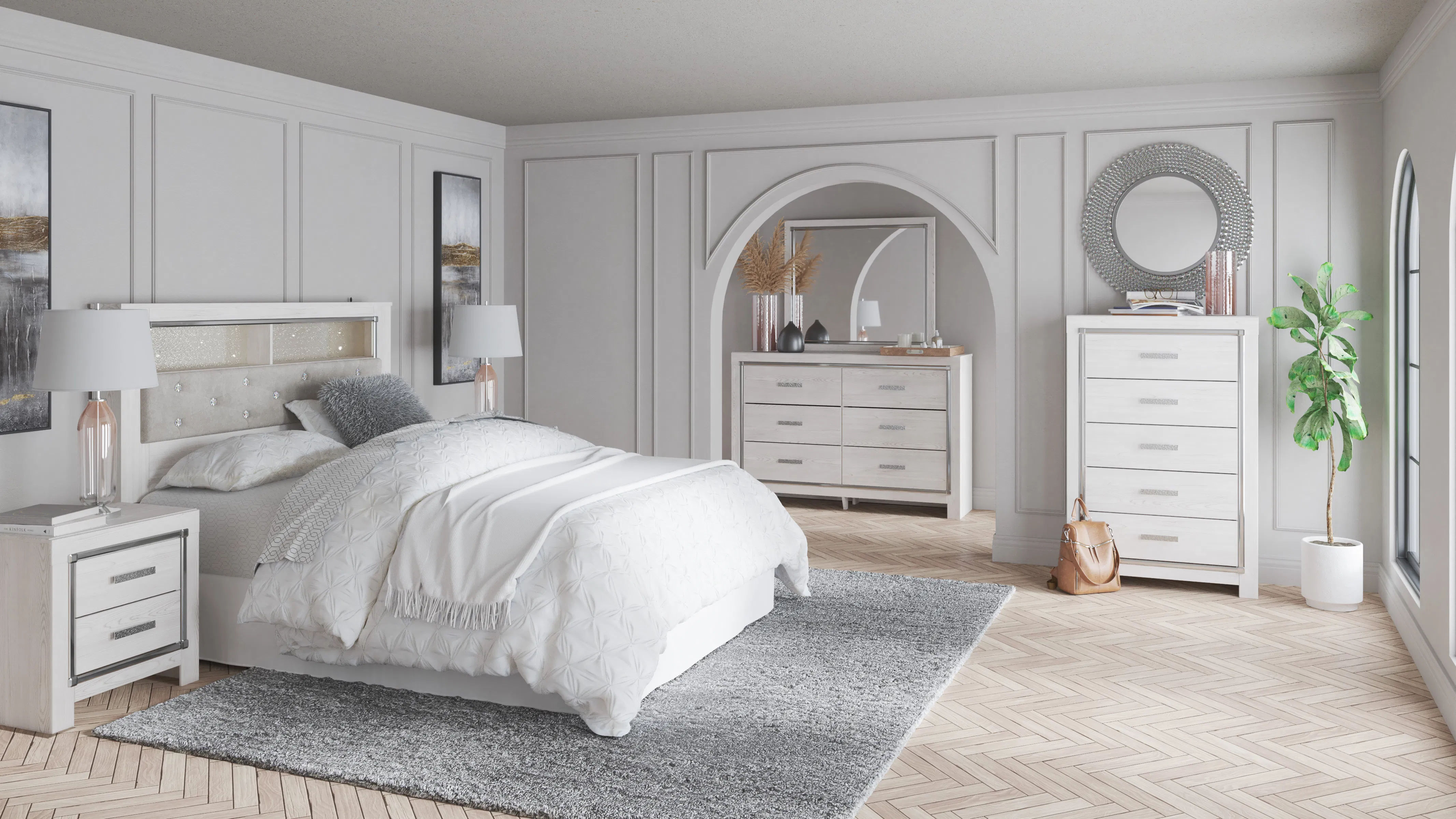 Luxe comfort meets chic design with the Altyra queen upholstered bookcase headboard with LED lighting.