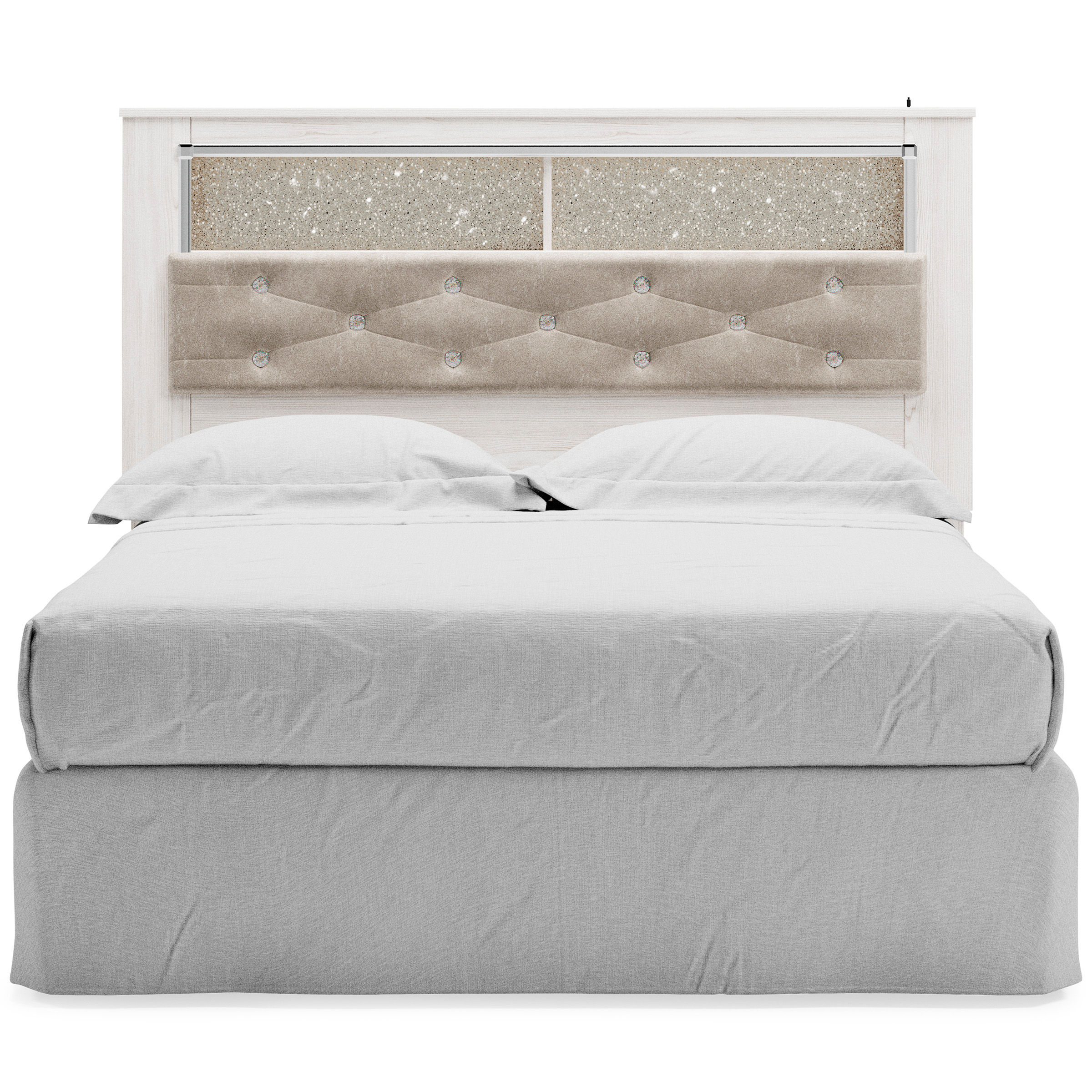 The epitome of fashion-forward design, this queen upholstered bookcase headboard is a beautiful blend of comfort and luxury. Shiny chrome-tone accents, a pearlized finish and button-tufted upholstery bring a glam touch to the richly rustic appearance. Remote-controlled LED lighting adds style and modern convenience to your restful retreat.
