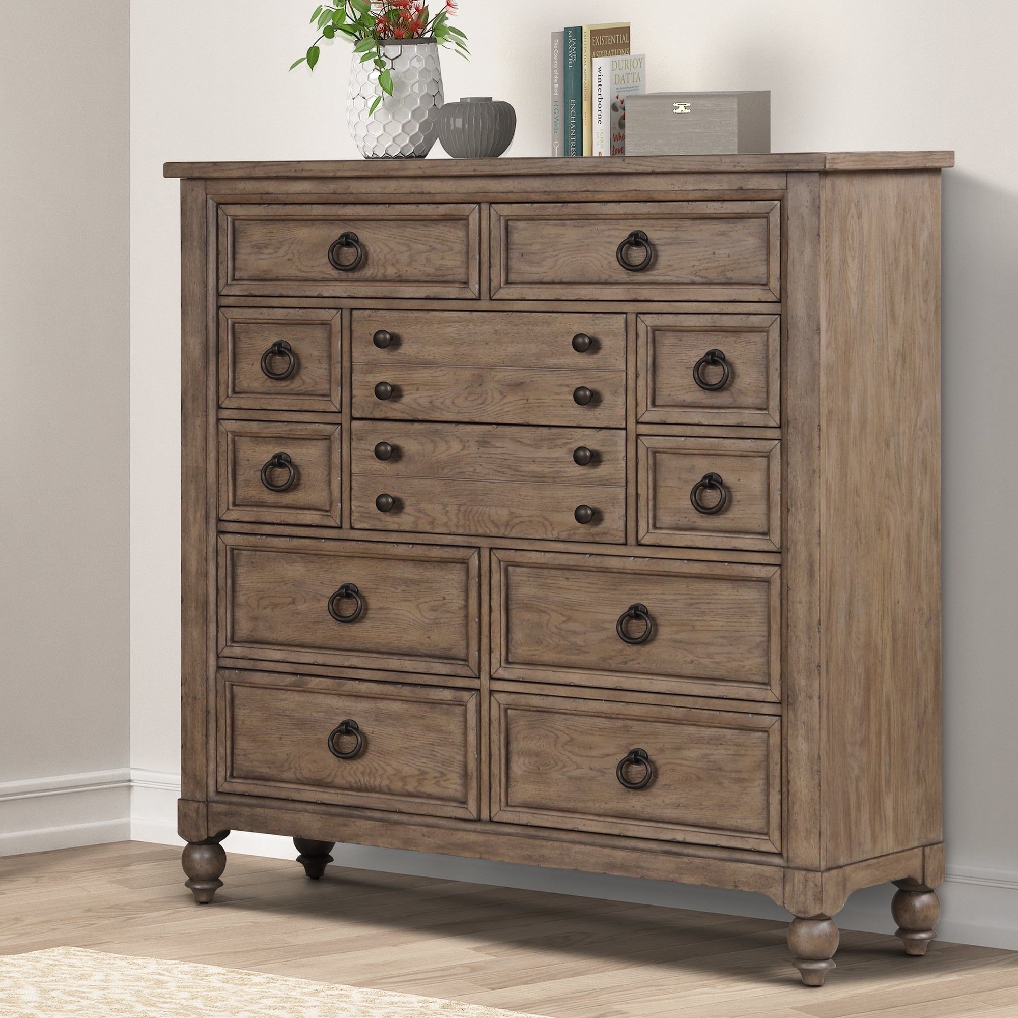 When details matter, choose the Americana Farmhouse 12 Drawer Chesser. Finished in a Dusty Taupe and accented with antique brass drop ring and knob pull hardware. All 12 drawers feature French & English Dovetail construction, wood framing with a beveled edge, and full extension drawer glides. The top drawers are felt lined, the bottom drawers are cedar lined, and the remaining drawers have a finished interior.