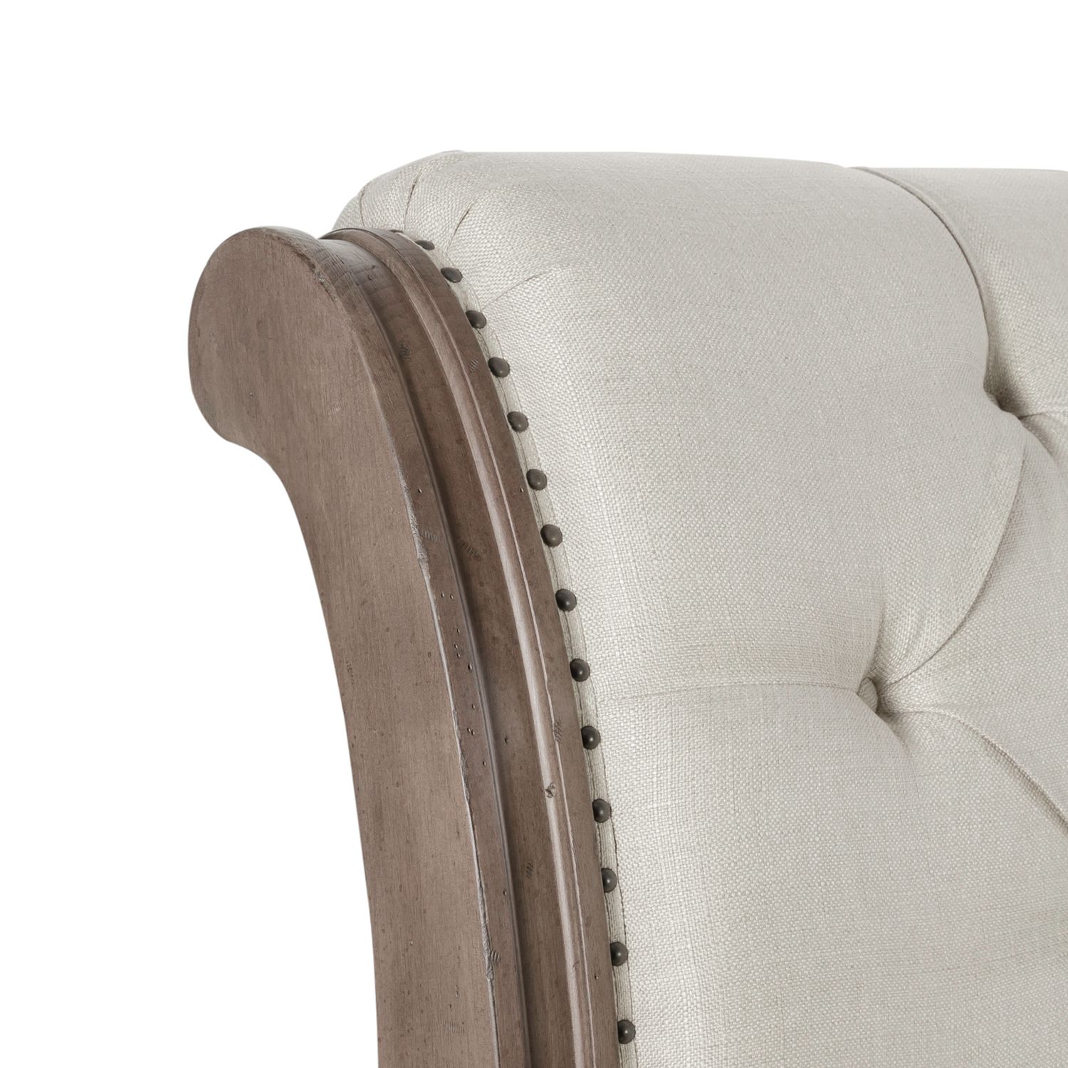 When details matter, choose the Americana Farmhouse queen sleigh bed. Crafted of poplar solids with white oak veneers, this bed features a wire brushed dusty taupe finish with worm hole distressing. The headboard and footboard feature a button tufted upholstered linen rolled top panel, framed by shaped solid wood pilasters with nail heads accenting the frame of the upholstery. The footboard has an exposed frame to create a deconstructed feel. With the bolt-on rails and center support slat system, this bed is sure to last. Americana Farmhouse evokes a style unconstrained and intended to be personal with an authentic craftsman’s flair and artistry.
