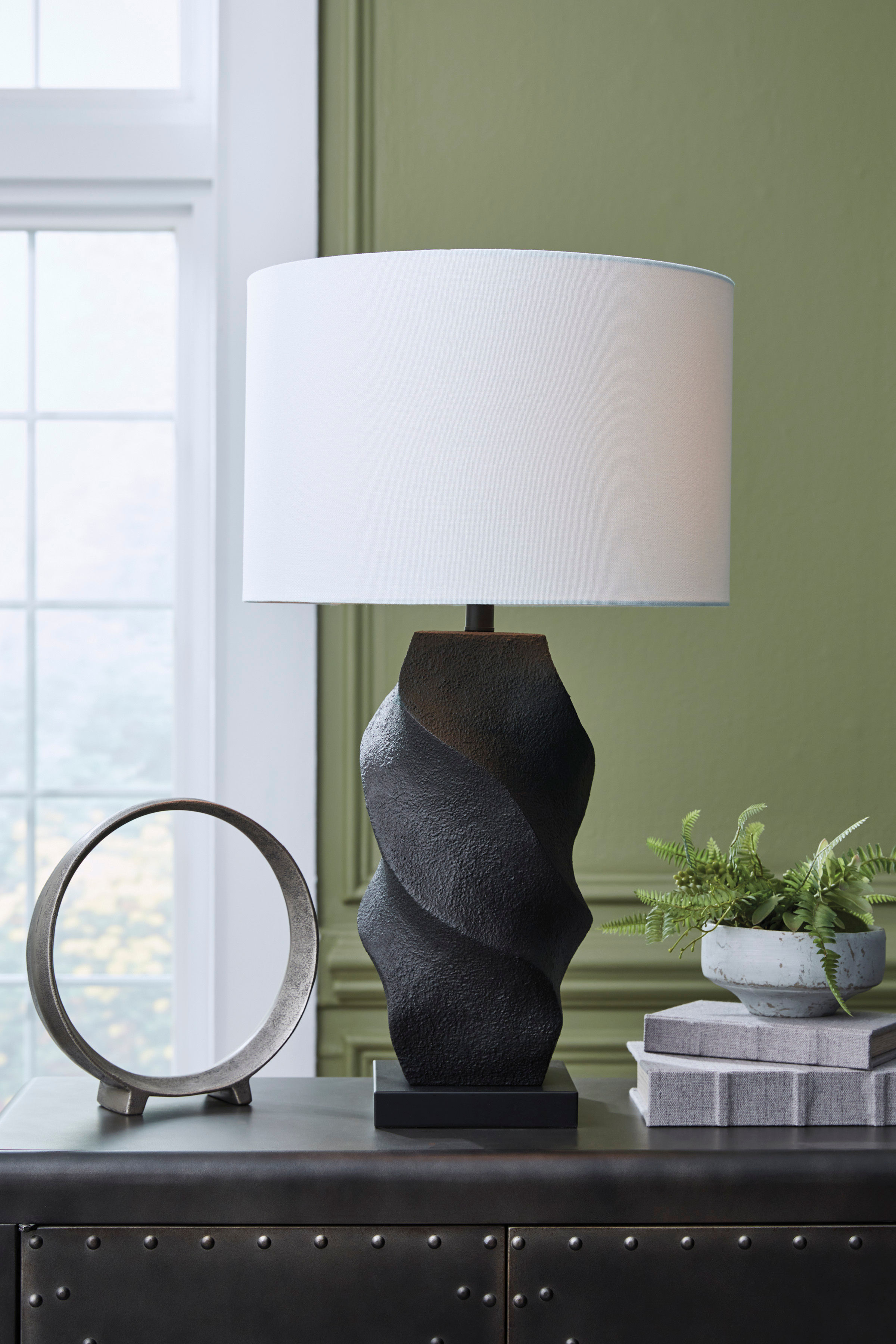 This table lamp puts a chic twist on casual lighting. Its base draws the eye in with a rich sense of movement, while the classic black finish has the versatility to pair with a variety of styles. Place it on a desk or end table for instant functional flair.