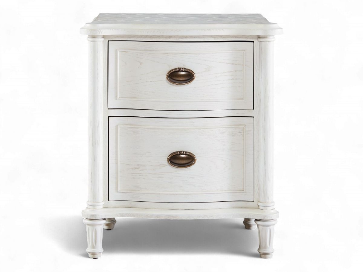 The elegant Amity nightstand features a timeless design with a vintage-inspired aesthetic. Finished in a soft, distressed white, it showcases a gently curved front and classic turned legs that add a touch of sophistication to any bedroom setting. The two spacious drawers offer ample storage for bedside essentials, each adorned with antique brass oval pulls that enhance its traditional charm.