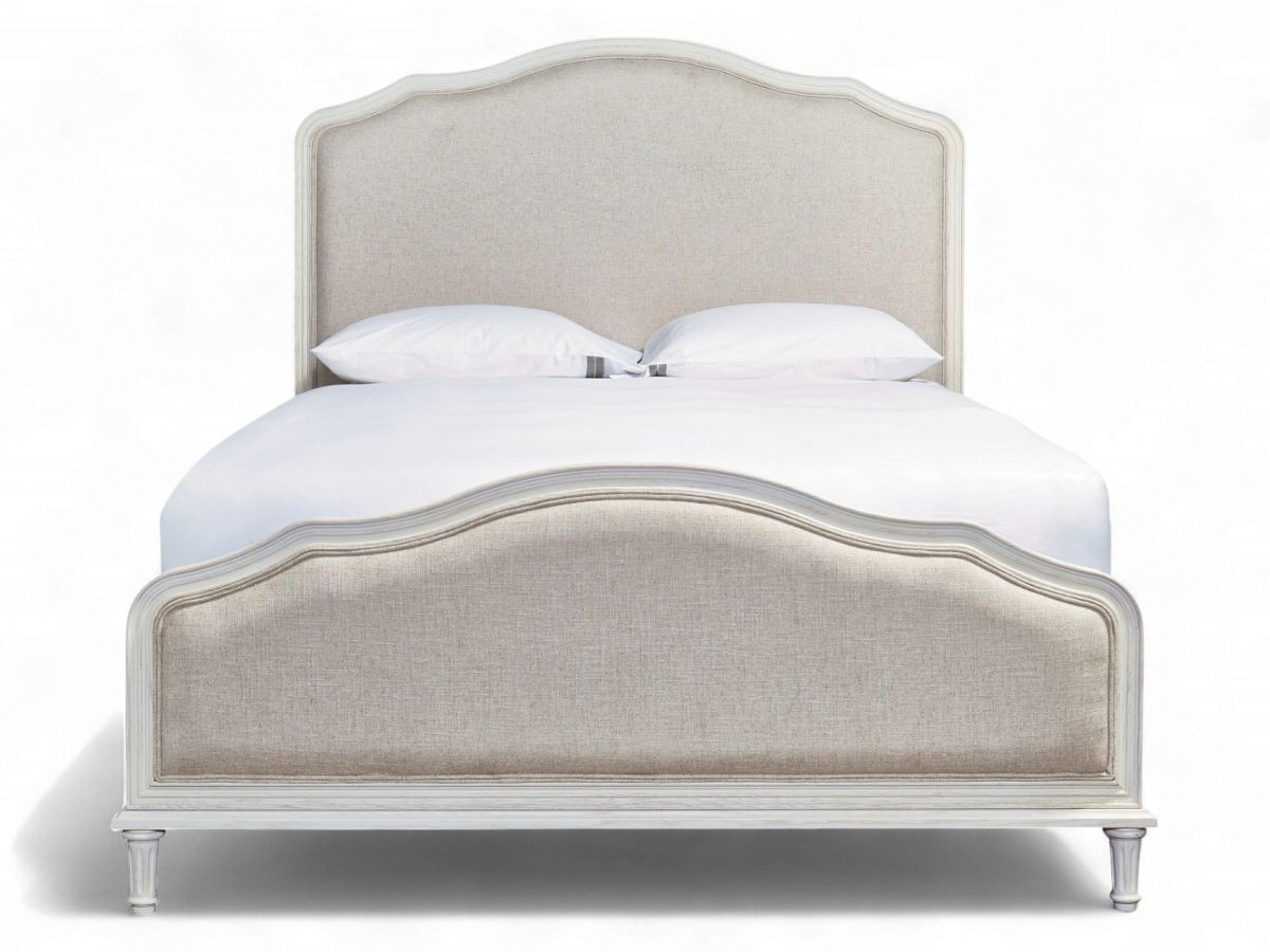 The Amity queen size bed exudes classic elegance with a soft, romantic touch. Featuring an arched headboard and footboard, both upholstered in a neutral, textured fabric, it offers a refined yet cozy aesthetic perfect for traditional or cottage-inspired interiors. The wood frame is finished in a distressed white tone that highlights the delicate moldings and graceful curves, creating a timeless silhouette.