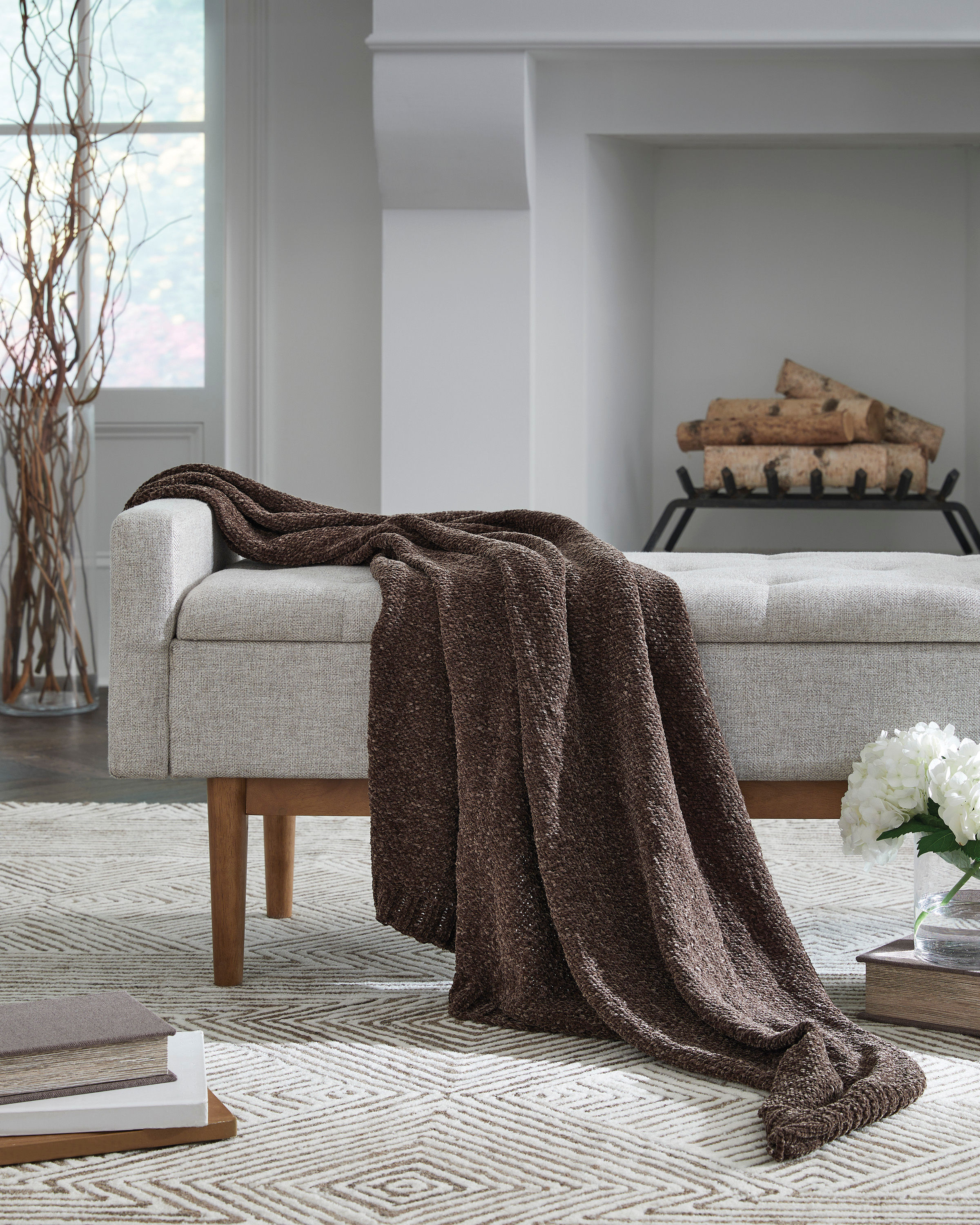 The Anawood throw blanket is made from polyester chenille fabric in brown.