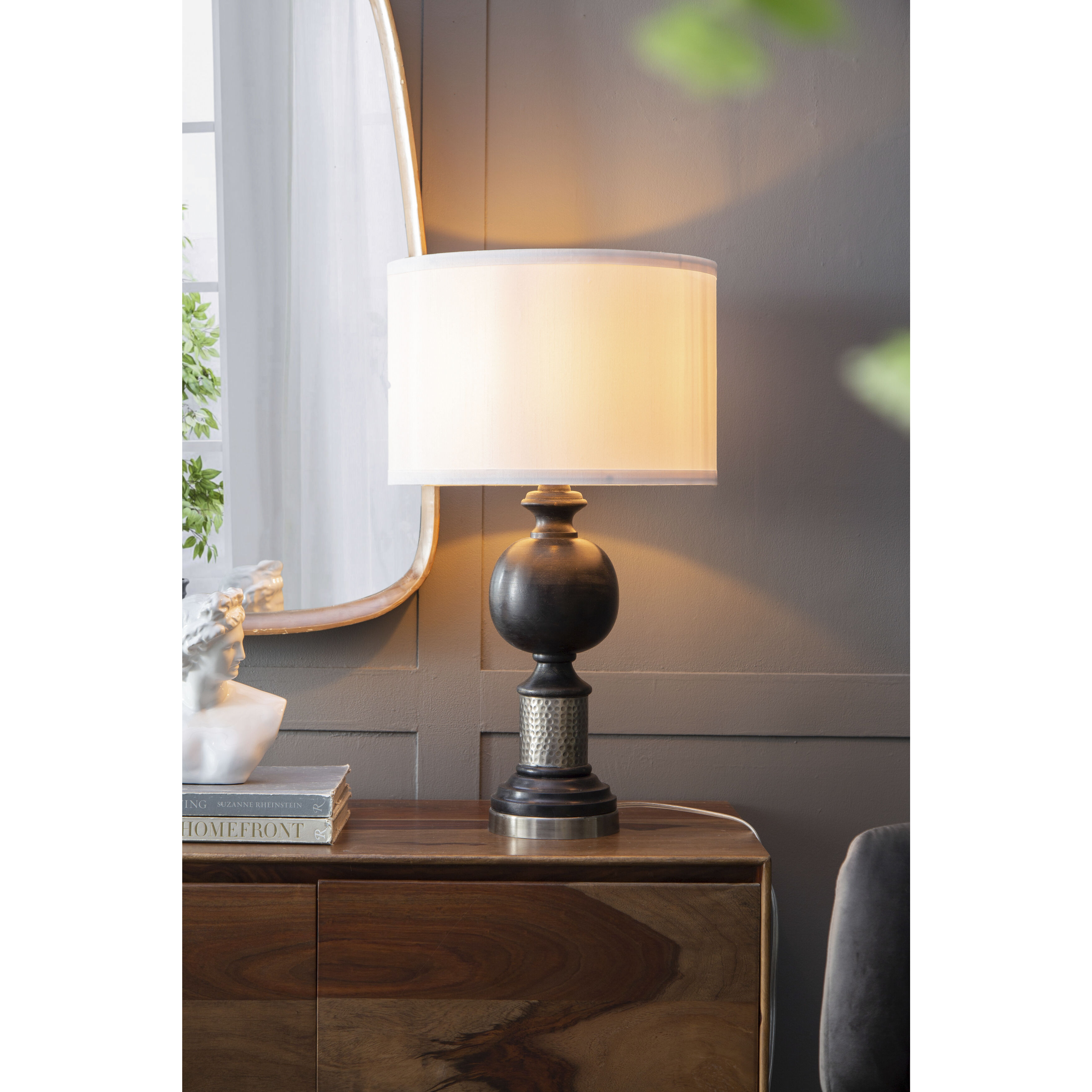 Crafted from a sturdy mix of iron and mango wood, this contemporary table lamp features a black and gray hue, a unique shape including a pedestal base and spherical ball in the middle of the frame, and a classic shade. An ideal size for your bedside table, a desk in your study, or a living room end table, it will catch the eye of your guests from any location. The fabric drum shade allows the lamp to emit a soft, warming glow that will spread a relaxing ambiance through your home.