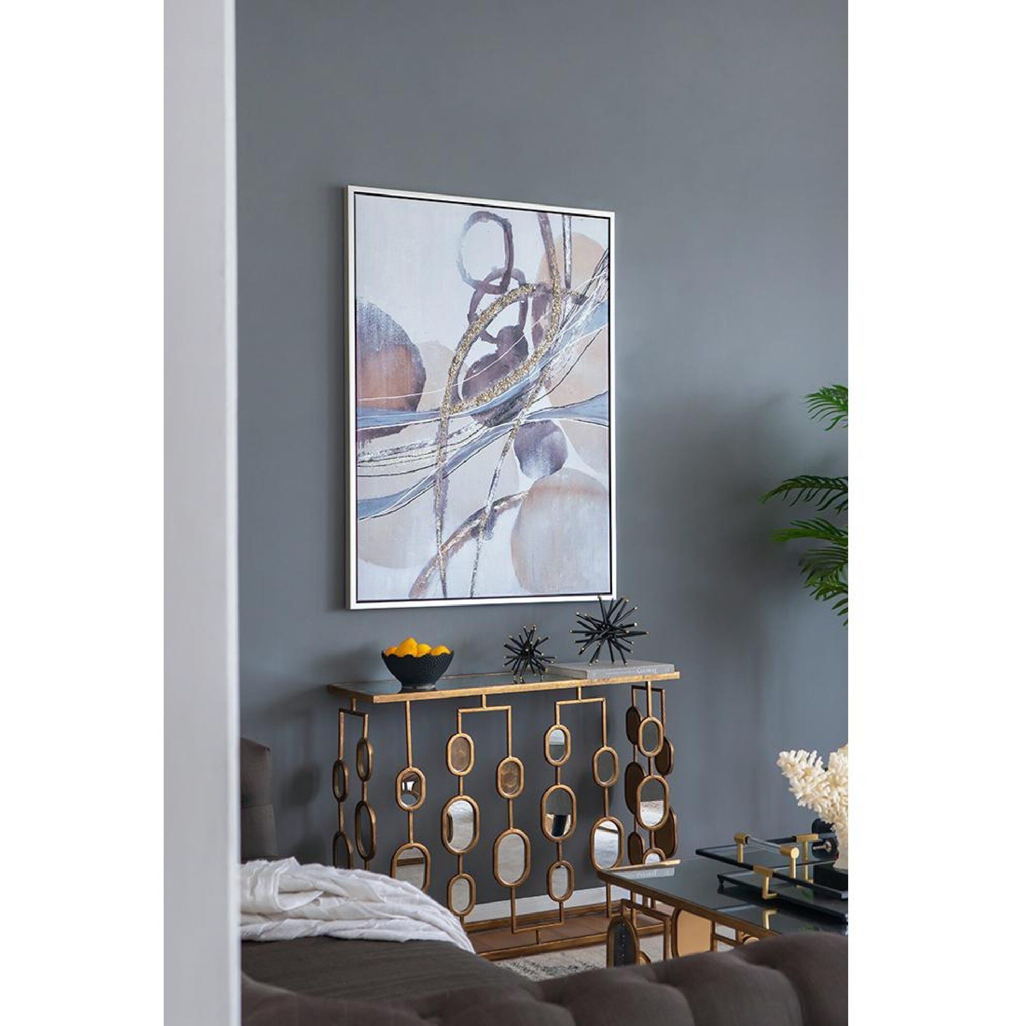 Made with shades of brown and blue, the abstract design on the Anita wall art complements many different interiors.