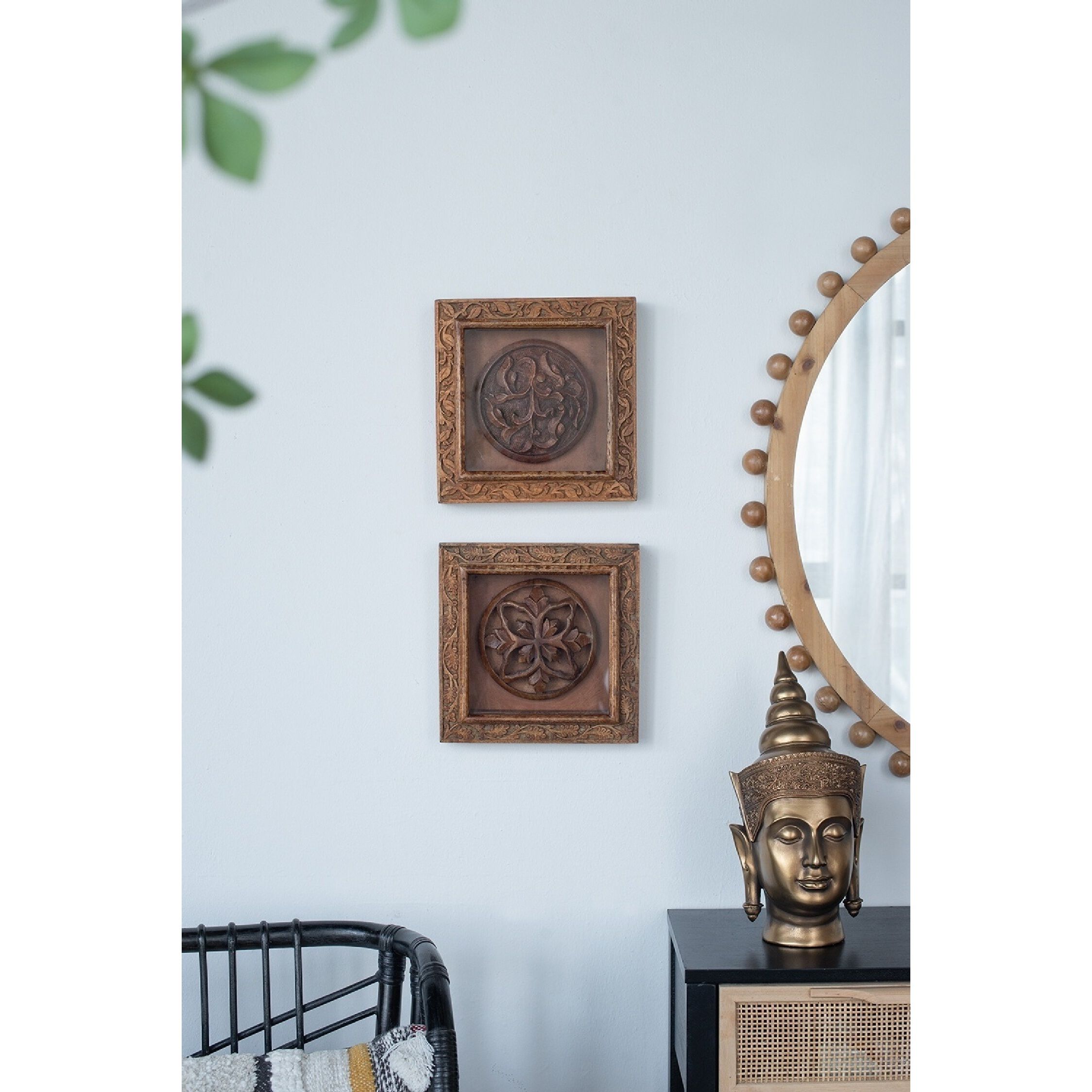 Beautifully handcrafted from rich mango wood, this set of two wall decor offers a warm, slightly rustic look that complements any home. Hang this elegant pair in a chic living room, globally-inspired entryway, or lush sunroom to enjoy the natural beauty of these carvings. Add additional mango wood pieces such as decorative spheres, boxes, or trays to bring a cohesive, rich look to your home.