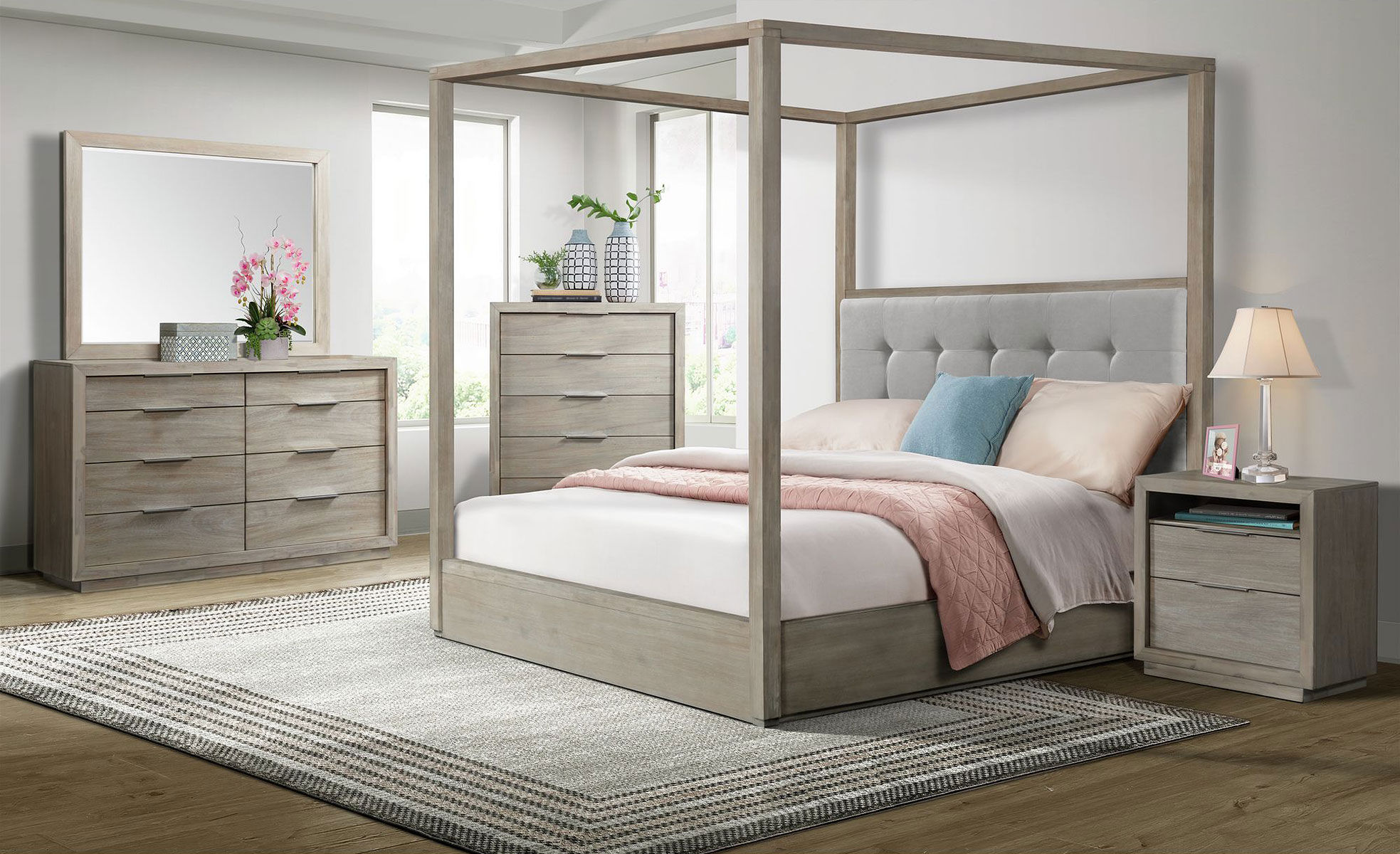 Add a modern vibe with the Arcadia nightstand with a gray finish. This nightstand has 2 drawers to store your bedroom essentials and a USB port to keep your devices nearby.