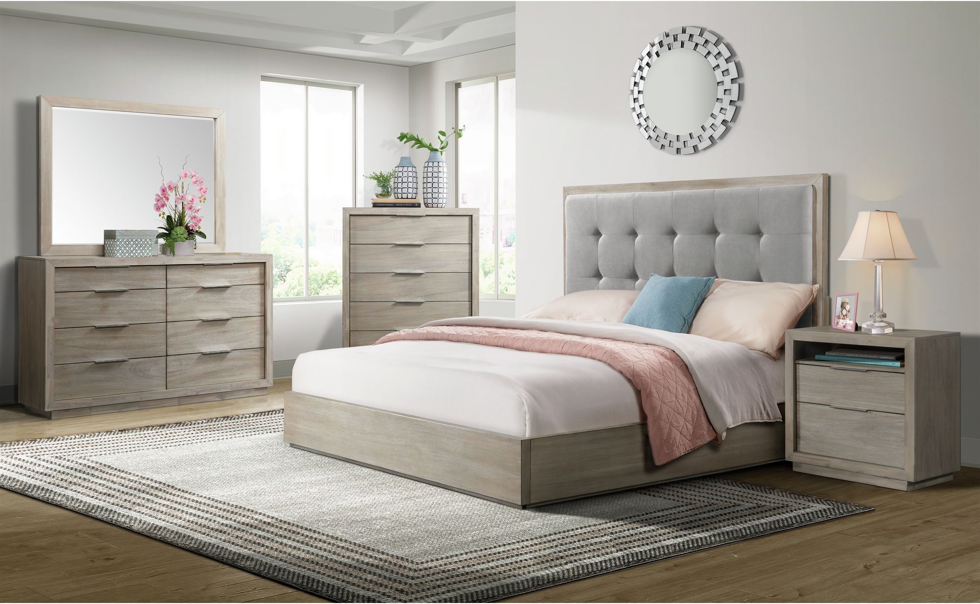 A modern design that adds style and visual interest to your bedroom, the Arcadia upholstered queen panel bed from Elements has a neutral color scheme that helps it blend with any existing decor you have. The gray finish on the wooden frame of the bed and the gray fabric upholstery on the headboard creates a serene vibe that will help you unwind after a long day.