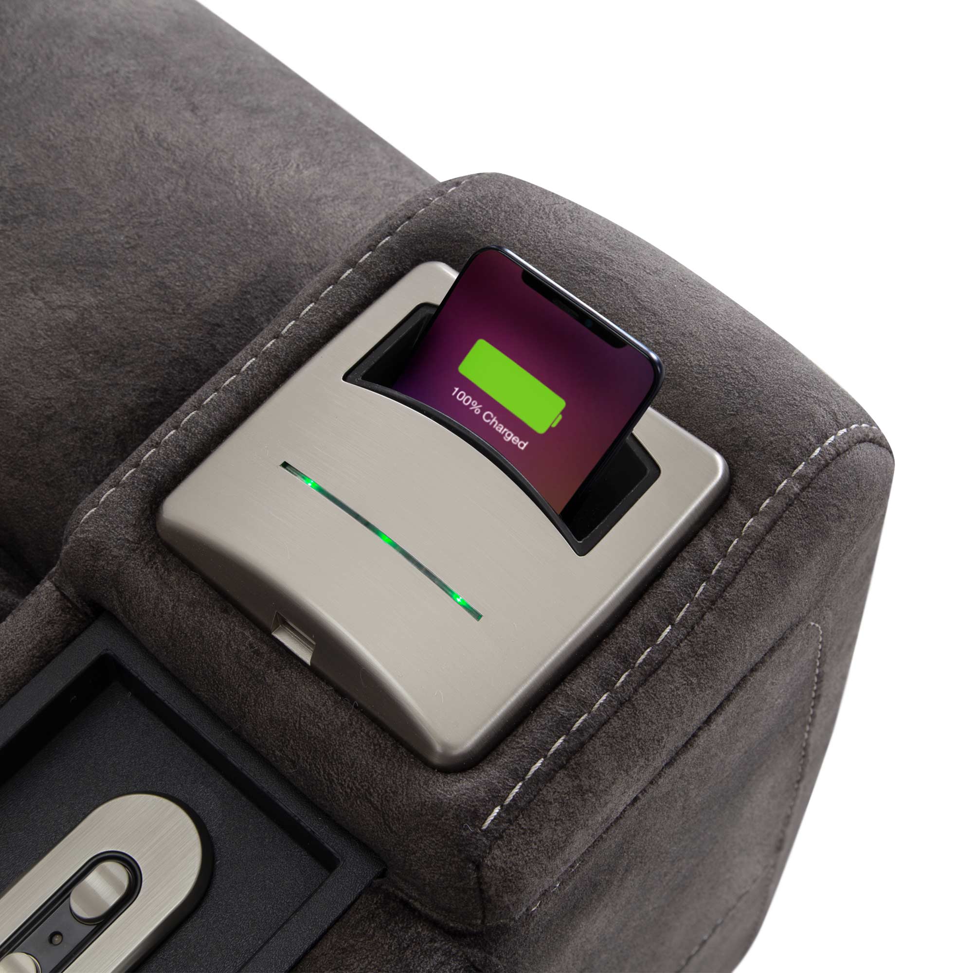 The 8507 Arlington Chair and a Half Power Recliner combines spacious comfort with modern innovation. Designed with a power footrest for effortless relaxation, it also comes standard with convenient wireless charging and a USB charging port to keep your devices powered up. Dual storage arms and a stainless steel cupholder provide easy access to your essentials while you unwind. Featuring our WOW Seating System, which blends precision-cut wood frames with gel-blended foam seating, the Arlington delivers superior support and plush comfort. With a sturdy 275 lb. weight capacity, this recliner is the perfect blend of luxury, functionality, and durability.