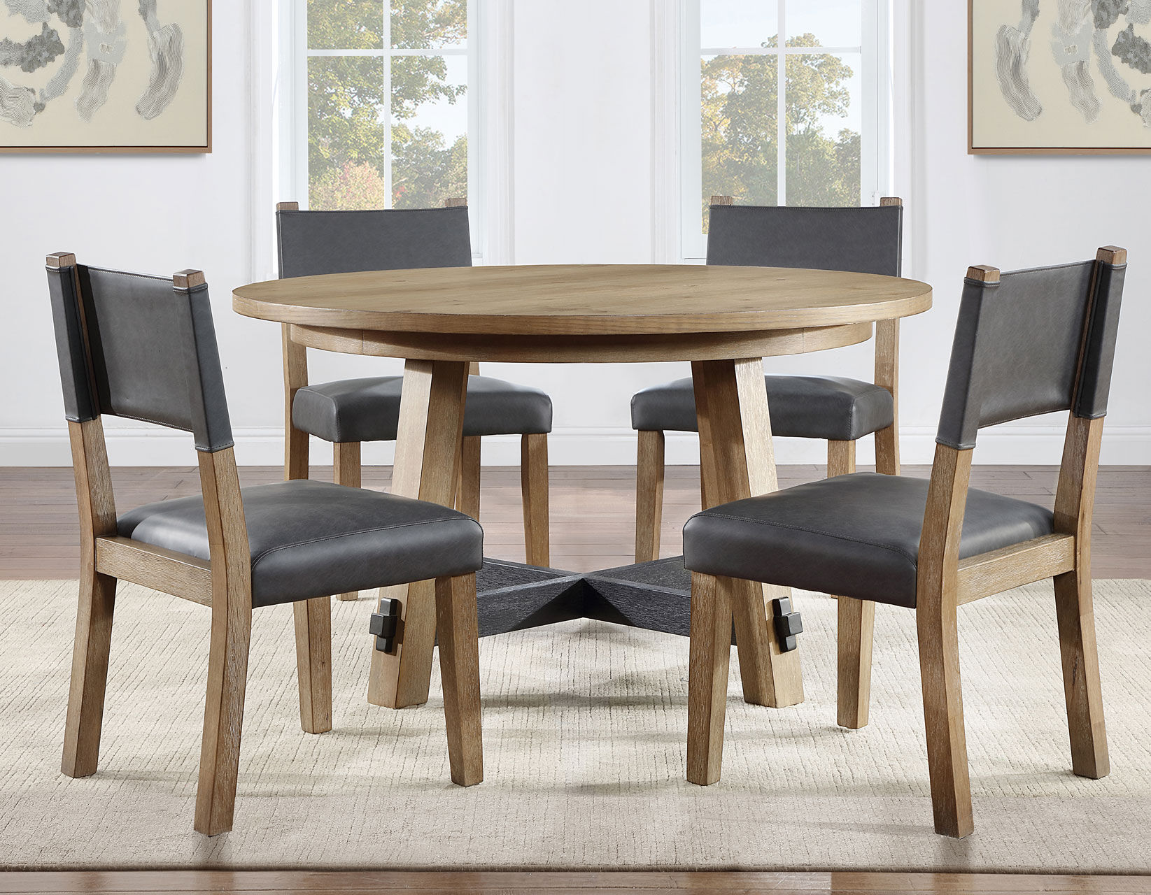 The 54-inch round Aubrey dining table is the embodiment of modern lodge design.. Crafted with acacia veneers, hardwood solids and a blend of craftsman influences and primitive styling, this table exudes timeless elegance. The lustrous driftwood finish, complemented by black stained stretchers and exposed tenons, creates a delightful contrast that adds versatility to the entire collection. Canted 3″ squared solid wood legs provide a sturdy foundation for the substantial 1.5″ table top, ensuring durability and longevity. With a 54″ round top, this table comfortably seats up to six guests, offering a more intimate dining experience.