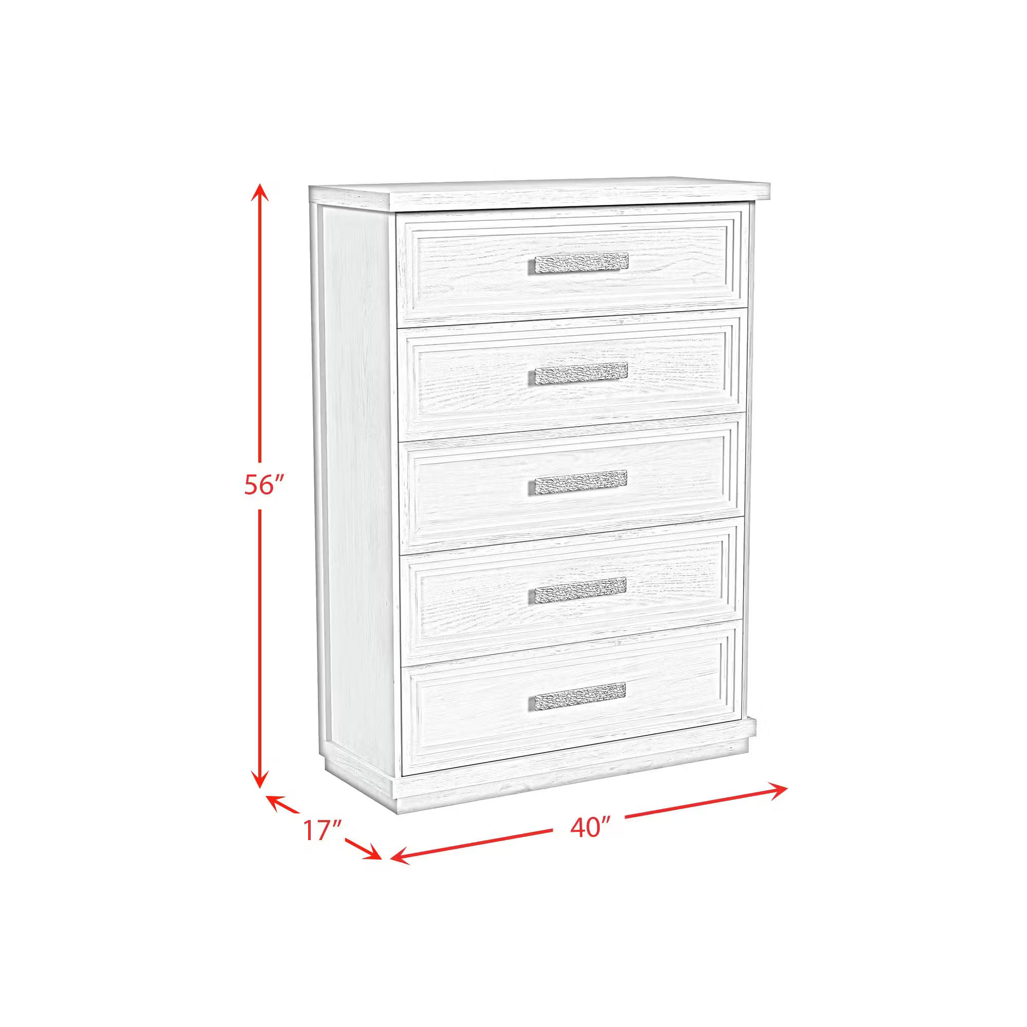 The Avalanche chest of drawers features a white finish with framed drawer fronts that add to the sophisticated style of this piece. The 5 drawers have ample storage space that will be sure to hold your wardobe.