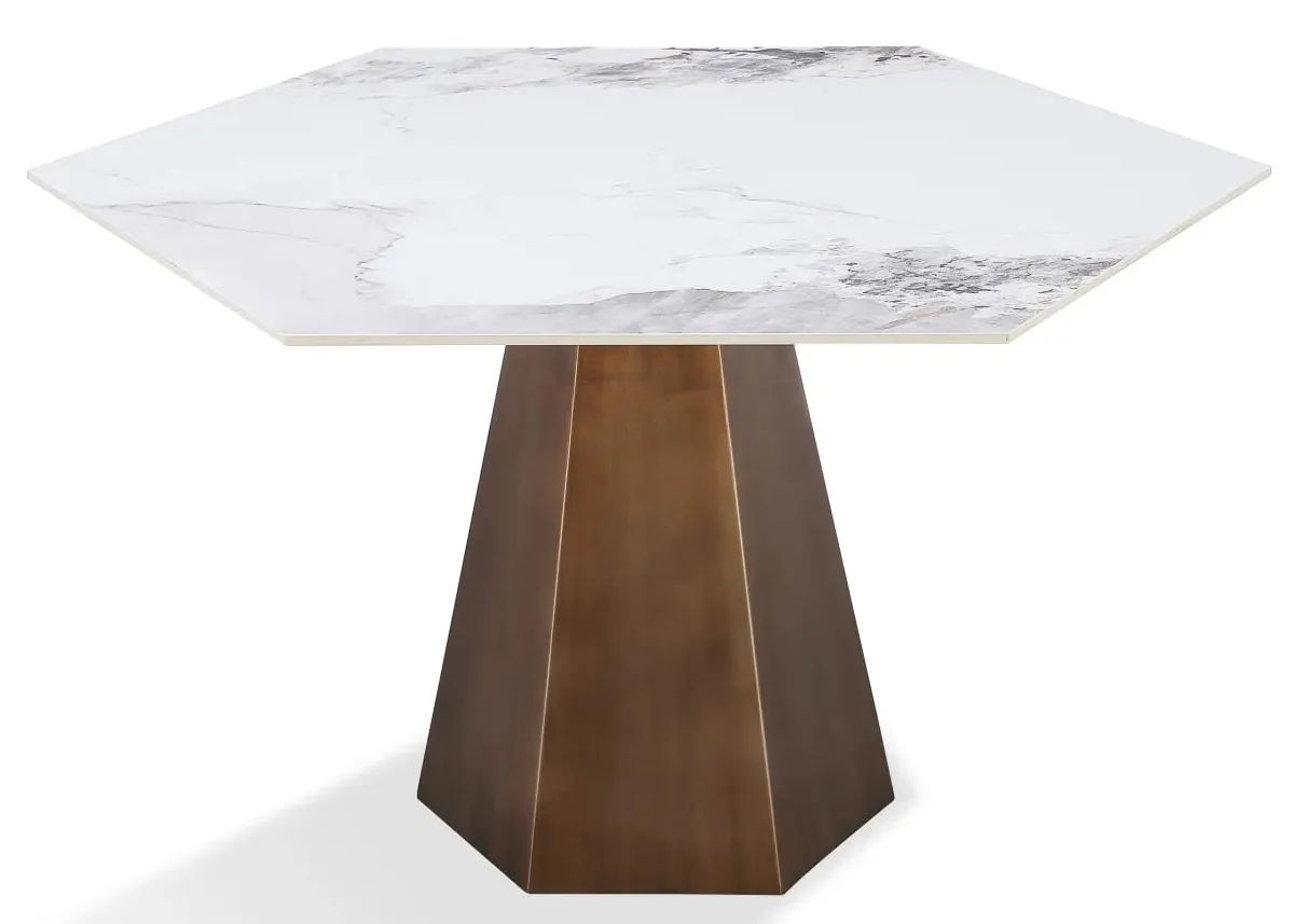 • Hexagonal table base is fabricated from steel sheet and finished in an earthy brushed bronze tone