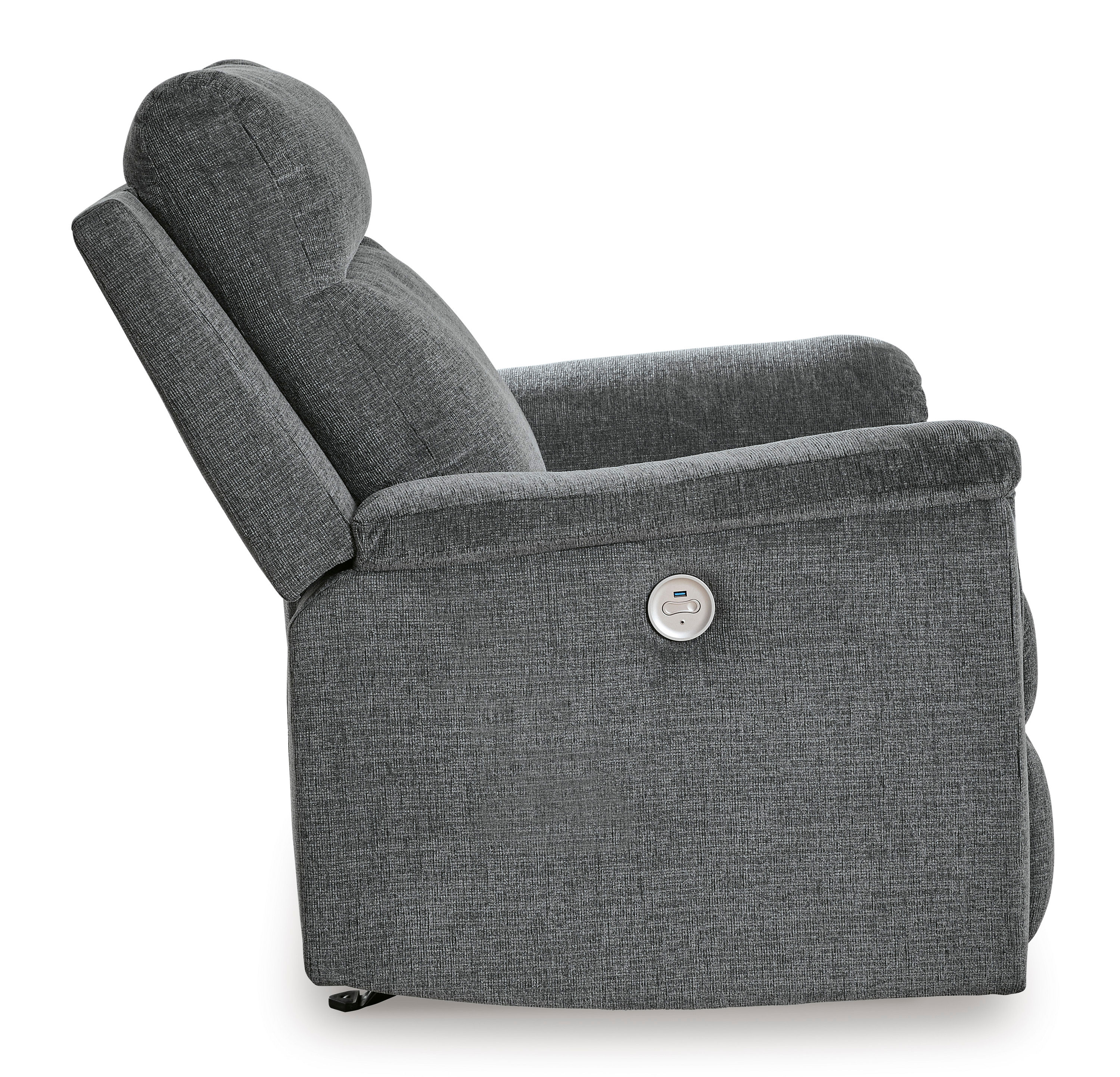 This power recliner has plush upholstery, casual style, and a one-touch button to recline.