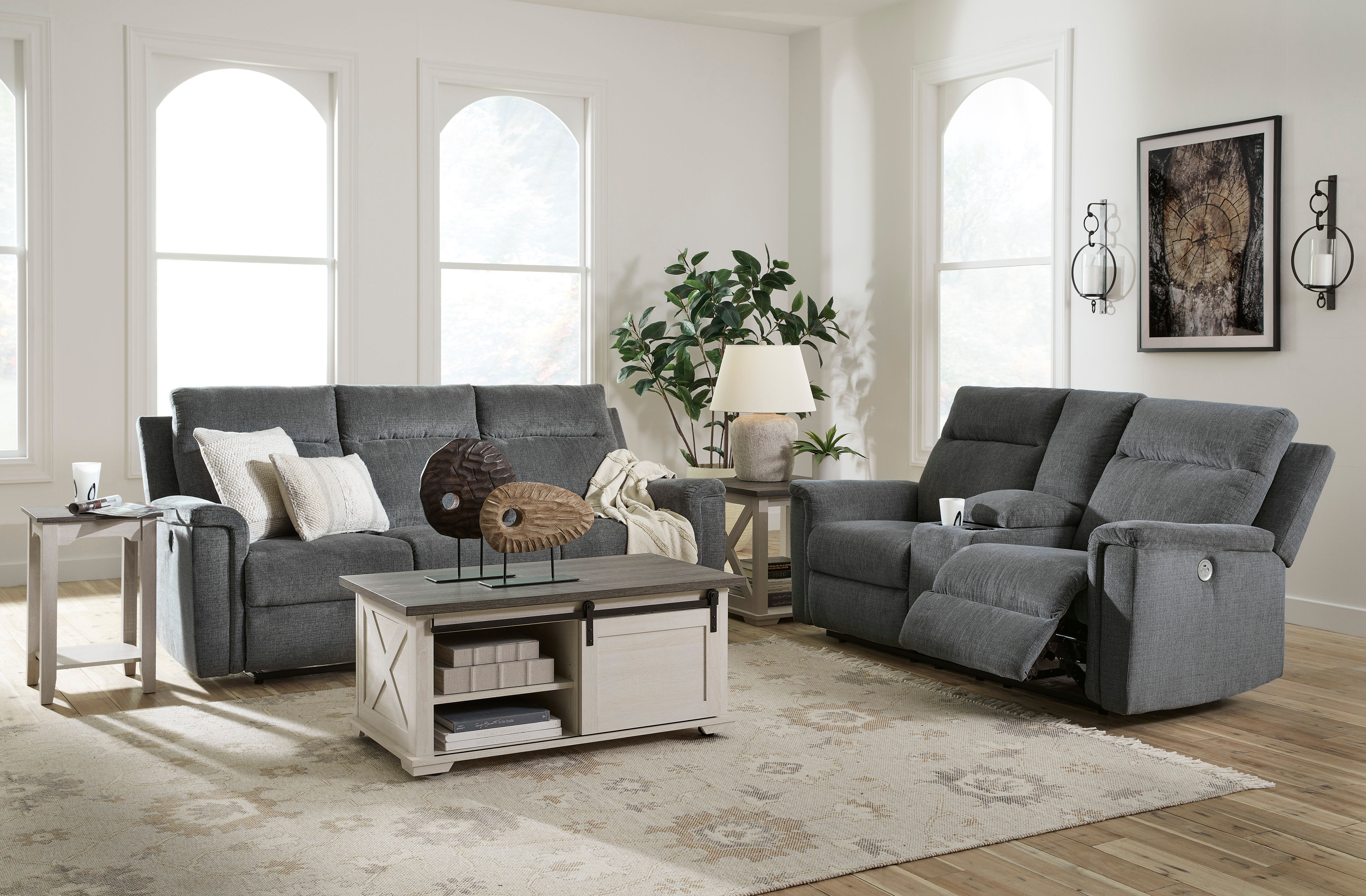 The ability to go from fully upright to relaxed and stretched out, all at the touch of a button, awaits. A beautiful blend of plush upholstery and casual style, the Barnsana power reclining loveseat with console invites you to sink into ultimate comfort. Easily tuck away remotes or gaming controllers and keep drinks close by with its handy console. Whether you're hosting guests or lounging alone, you’ll find it hard to leave your living room—that’s a given.
