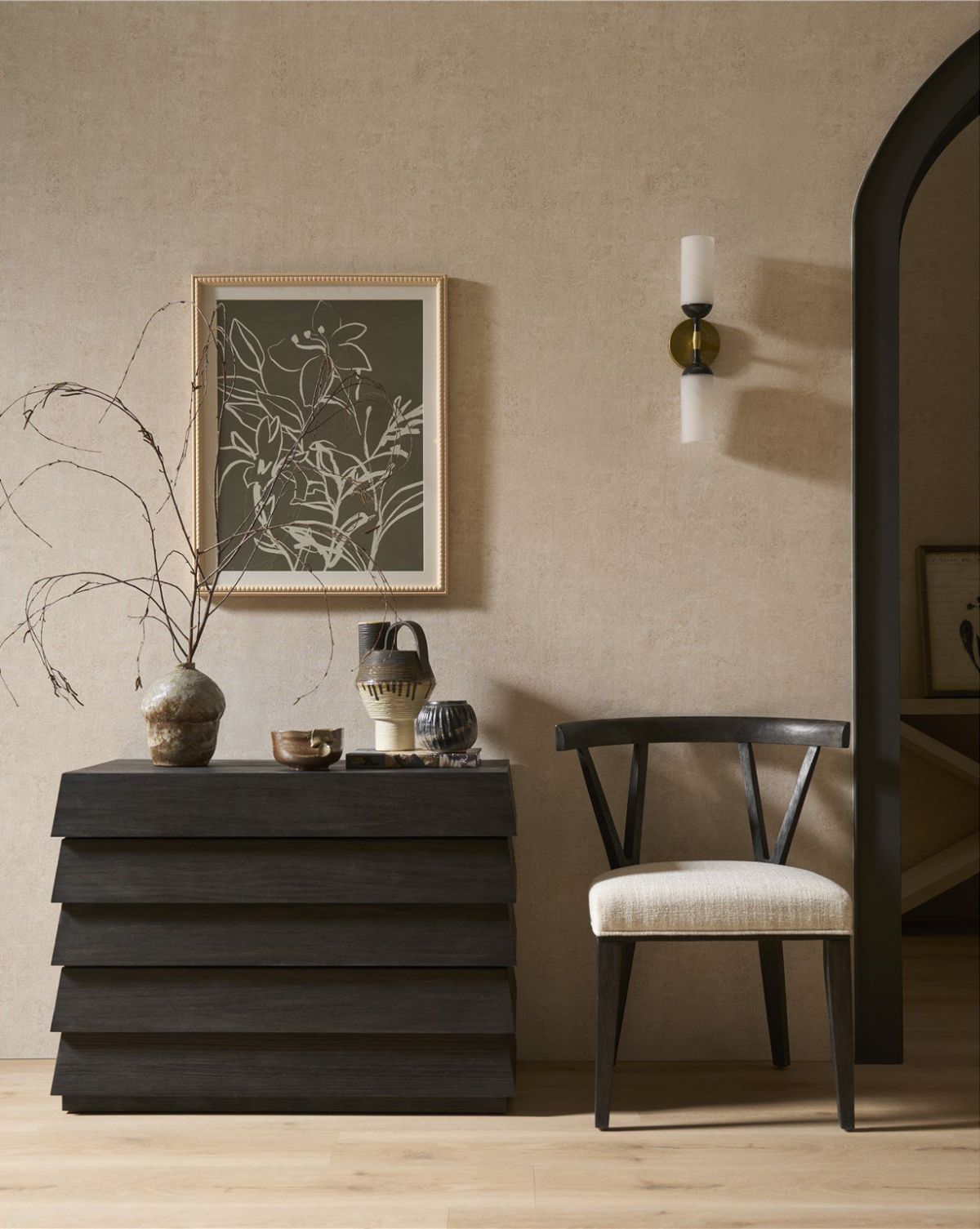 The Basalt Side Chair offers a refined seating solution with its elegantly curved back and upholstered seat. Finished in a striking Basalt, its clean lines and minimalist design bring a touch of understated sophistication to any dining or living space. The chair's comfortable form and natural wood finish create a harmonious blend of style and practicality.