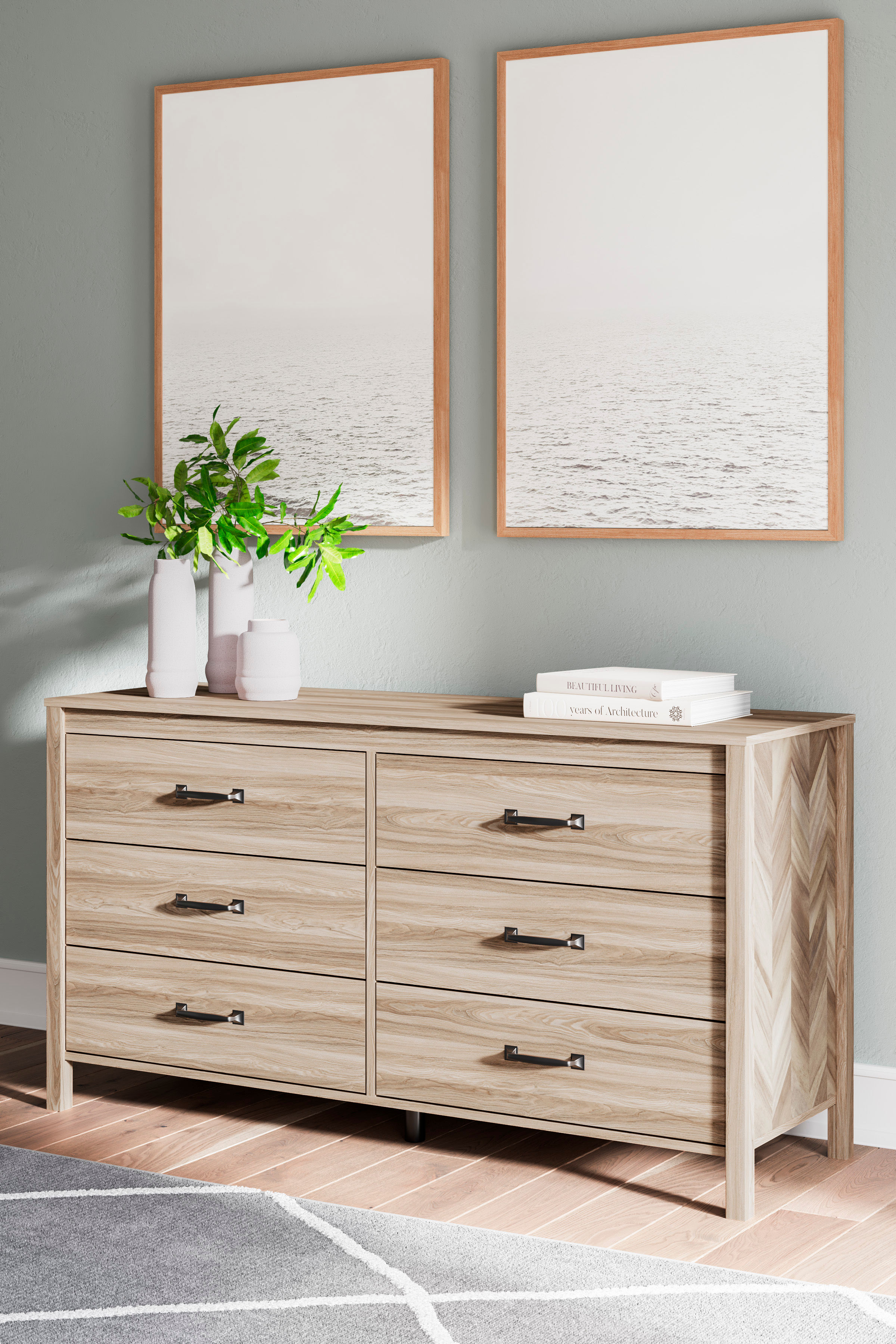 Transform your bedroom into an instant sanctuary. The Battelle dresser introduces a touch of mid-century modern style combining a two-tone finish and unique chevron pattern that is sure to enhance the design element to any bedroom. Six spacious drawers with ball bearing glides offer a smooth opening and closing of the drawers. Catering to your busy lifestyle and built to last, it is ready to assemble in the comfort of your home.