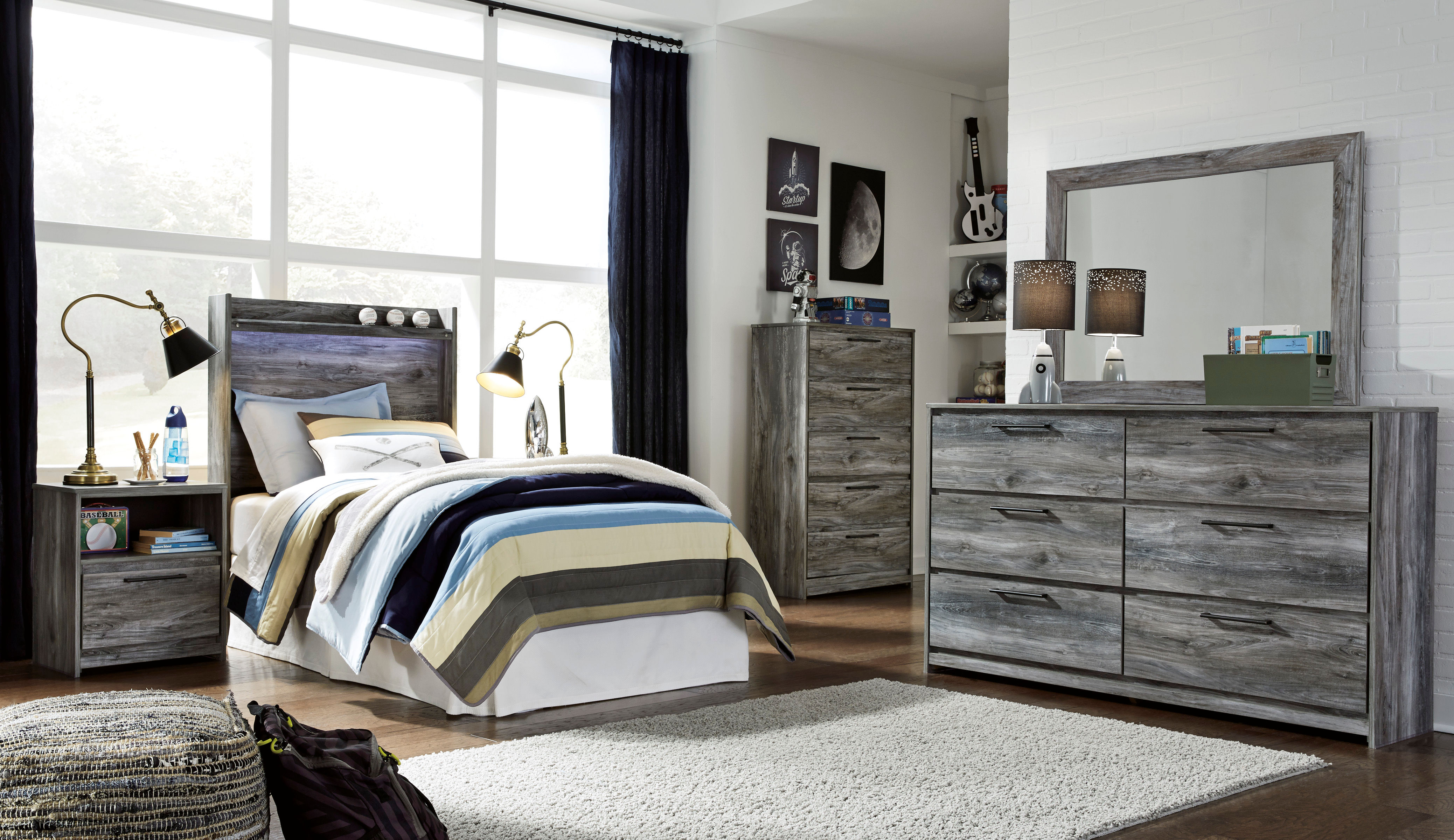 Rest in the beachy style of the Baystorm twin panel headboard. Its driftwood and surfer-inspired smoky finish and cool LED lighting give this headboard a rustic look that's perfect for creating an island oasis. Clean lines and modern charm blend for an authentic look to be enjoyed for years to come.