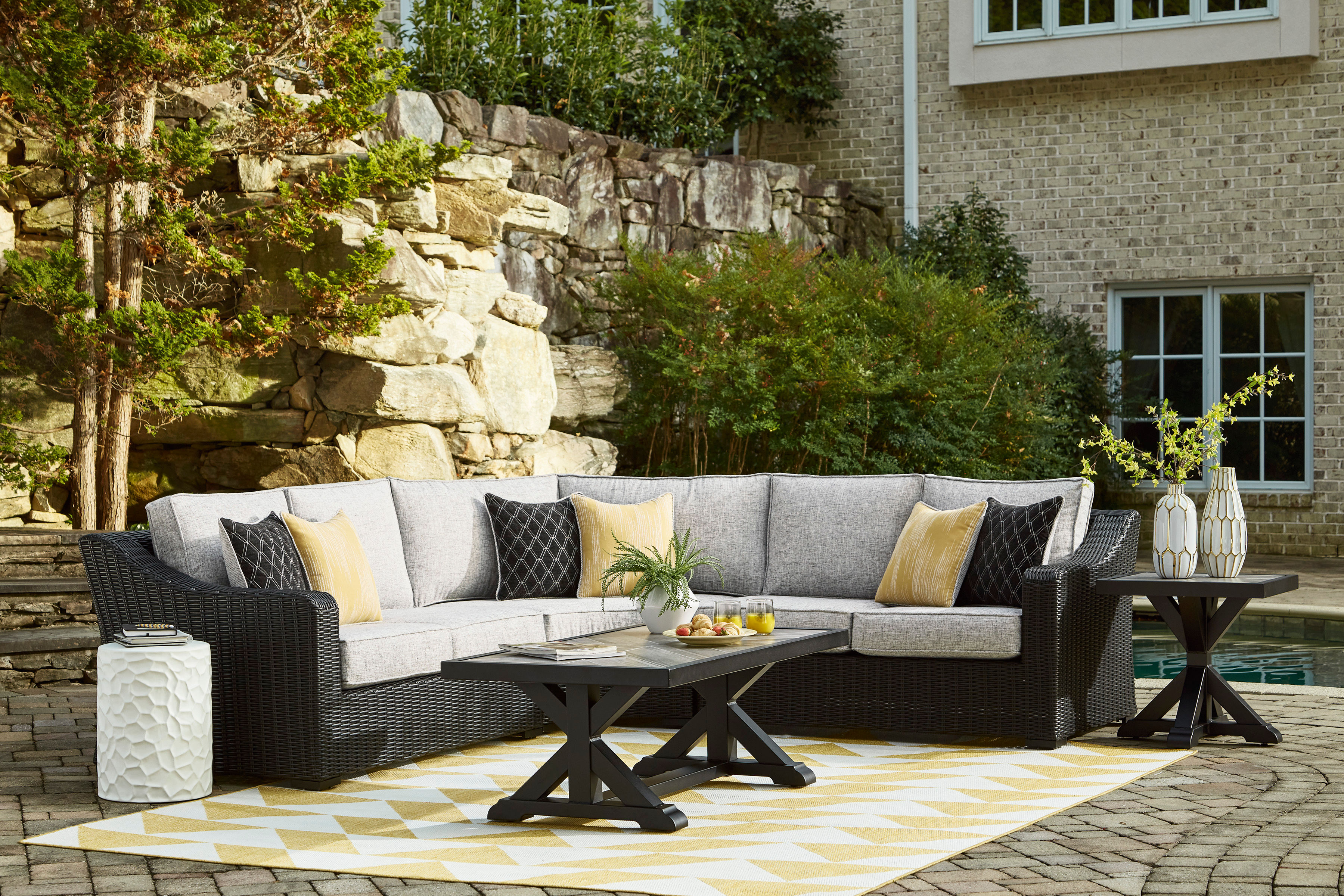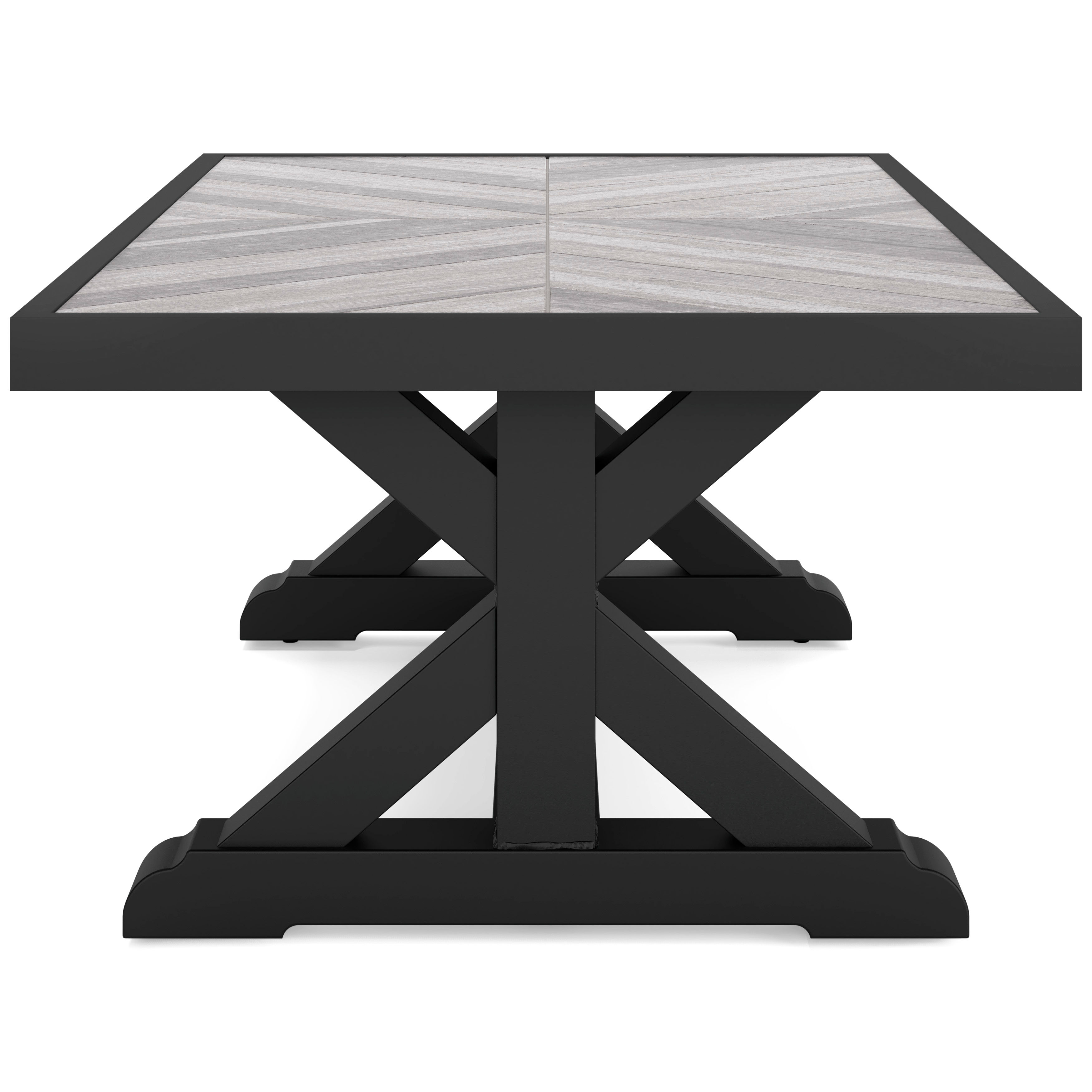 Sporting an easy-on-the-eyes elegance, the Beachcroft coffee table elevates the art of alfresco living. Beautiful and durable enough for indoor and outdoor use, this high-style/low-maintenance table charms with X-leg farmhouse styling. With a unique reverse diamond tile pattern, the thick porcelain tabletop provides unparalleled sophistication.