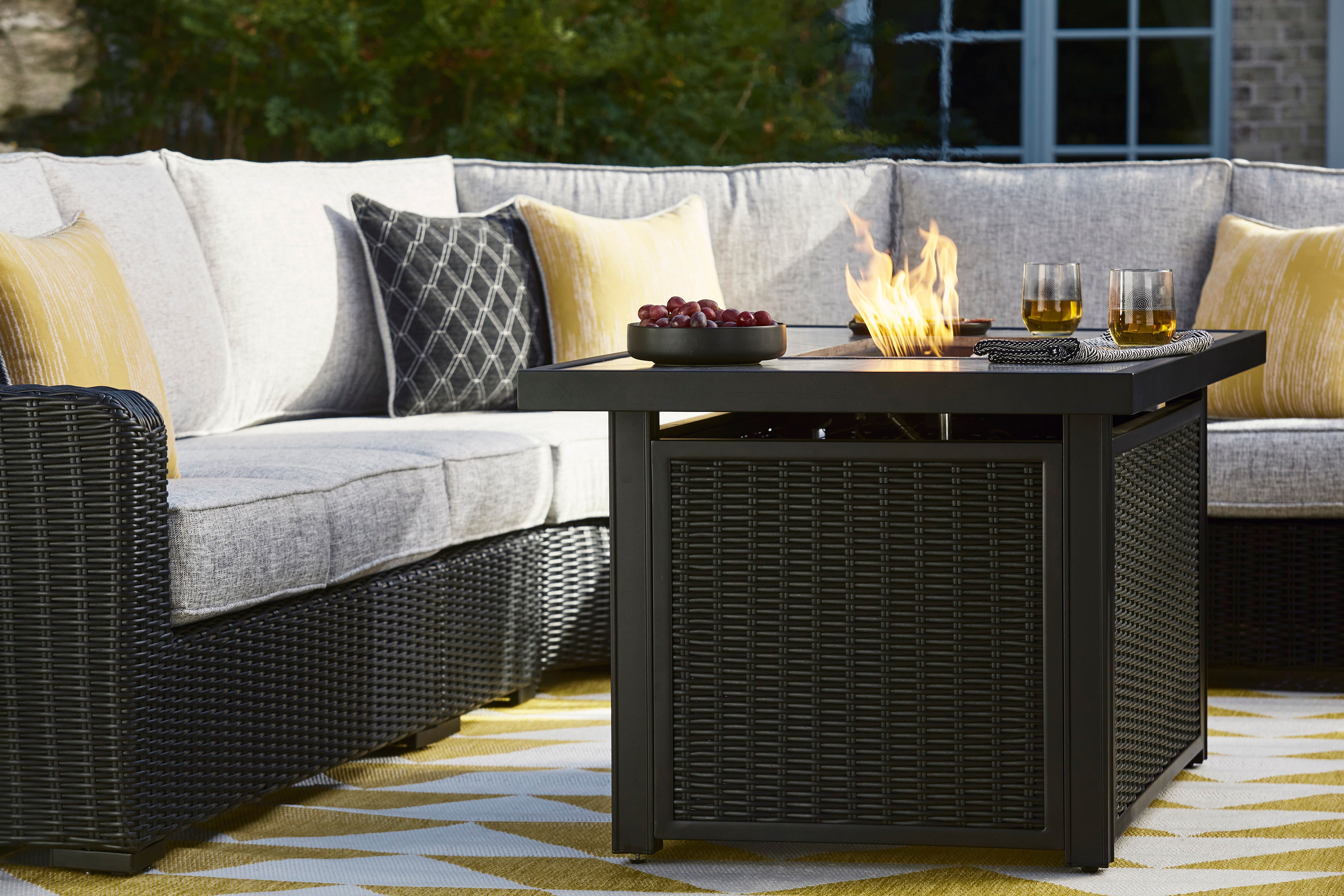 Sporting an easy-on-the-eyes elegance, the Beachcroft fire pit table elevates the art of alfresco living. Its handpainted top is paired with all-weather resin wicker over rust-proof aluminum for beauty and brawn. A stainless steel burner with glass beads adds a captivating element that is sure to wow.