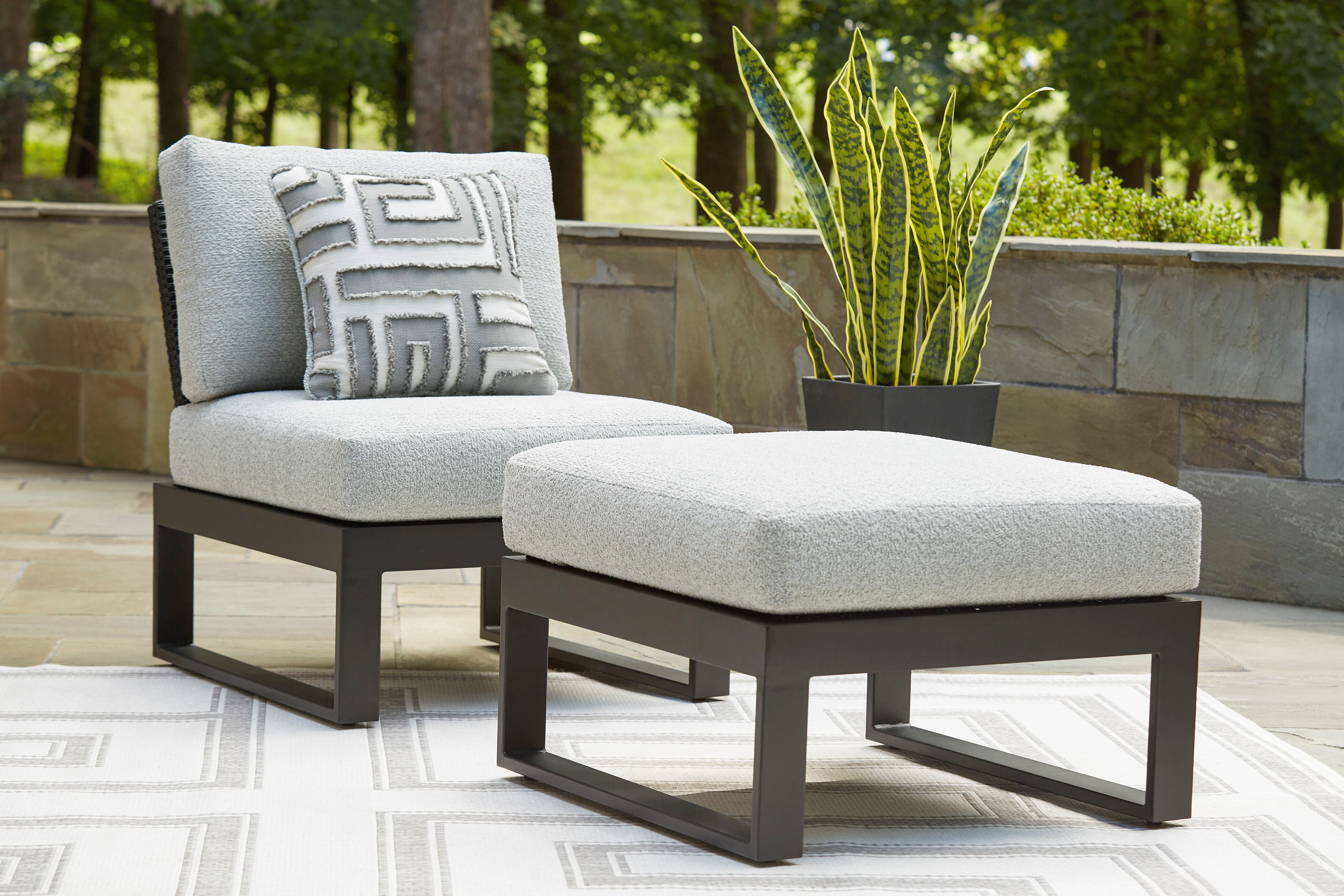 Sleek, contemporary style meets outdoor living in this ottoman. Its clean-lined black aluminum frame expertly balances good looks and longevity. And the enhanced UV resistance of Nuvella+™ fabric keeps the cushion light and bright, weathering the seasons beautifully. With this ottoman on the back porch or poolside, you can confidently curate a luxe vibe.