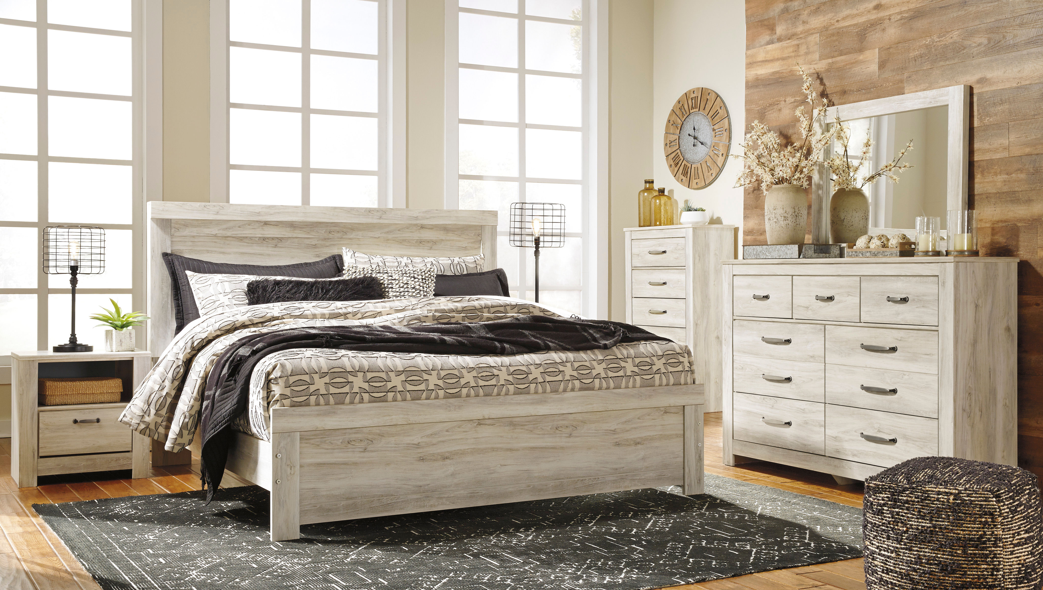 Discover modern farmhouse charm with the Bellaby king panel bed's rustic elegance.