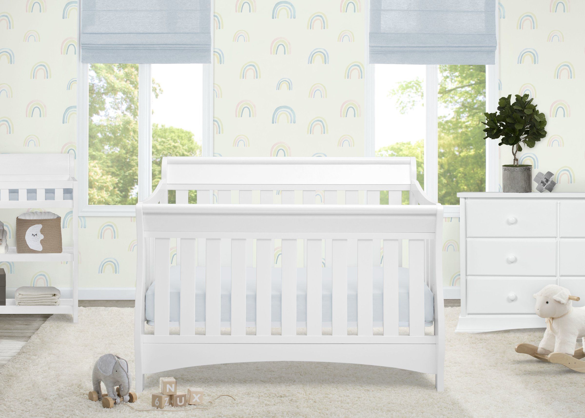 The Bentley 4-in-1 crib with a white finish has a sleek design with durability for the nursery.