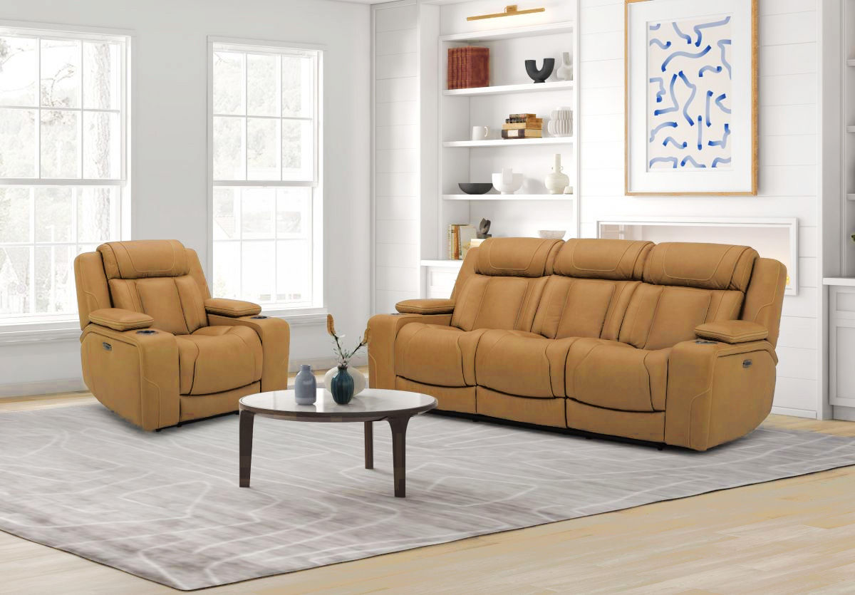 Built for comfort, function and family, the Bentley power recliner is meant to be lived in. This style features brown leather upholstery and plush arm cushions. This recliner has various function options, including power recline and cupholders on each arm rest.