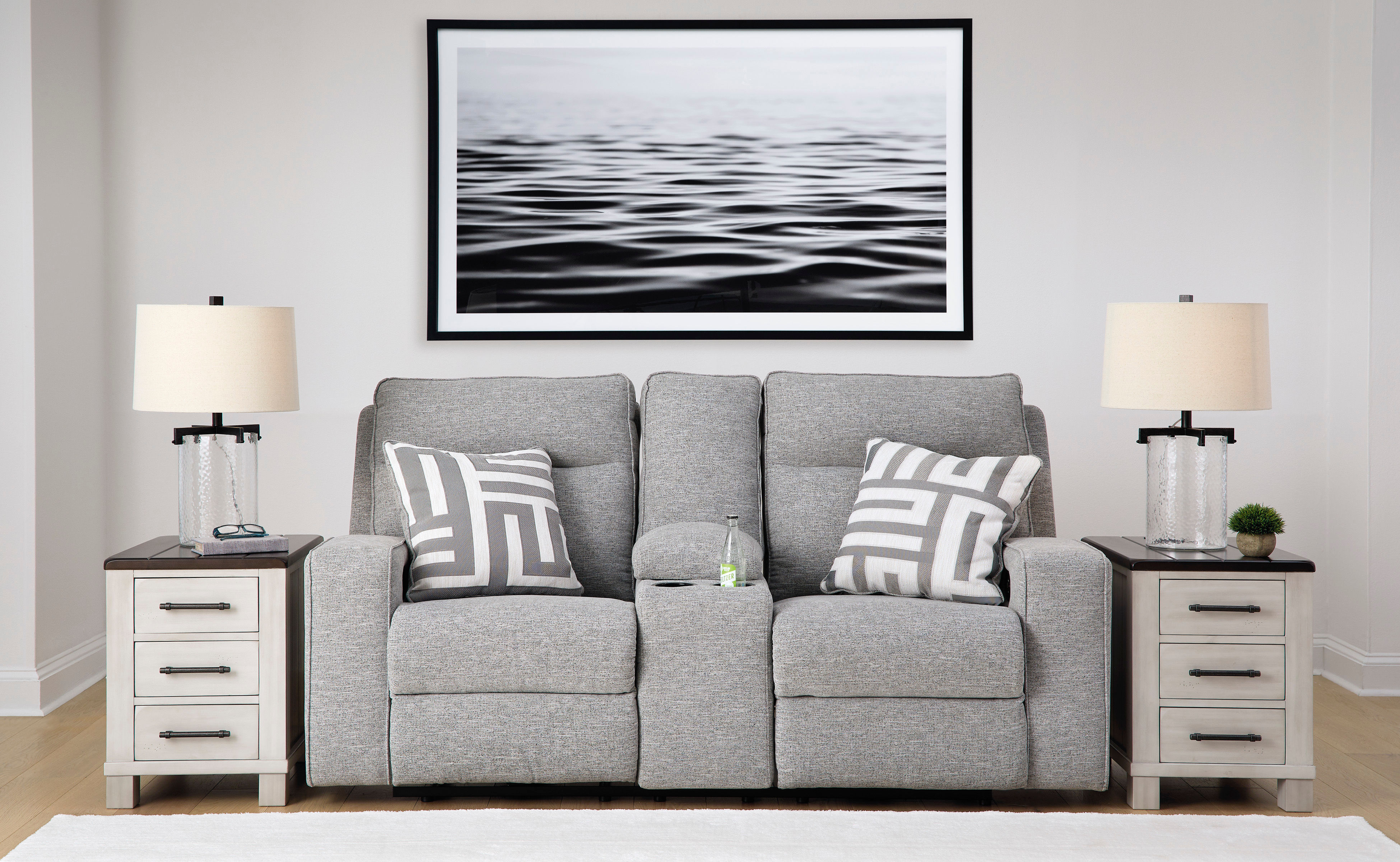 Elevate style with Biscoe power-reclining loveseat, made with contemporary design and high-performance fabric.