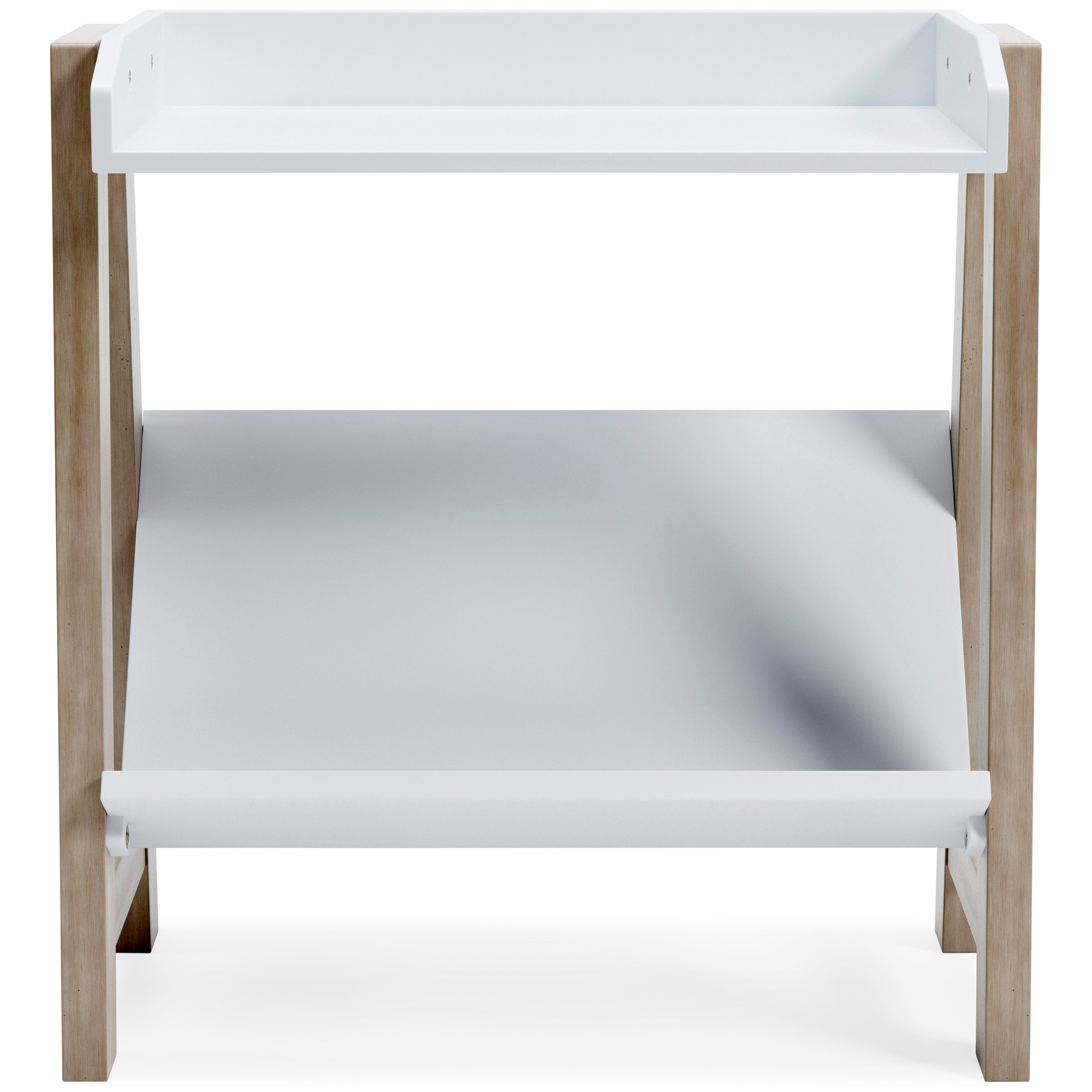 Whether for storage or display, the stylish Blariden small bookcase provides the perfect place to prop up their ever-expanding book collection. The unique angled lower shelf and gallery rail top in white charmingly contrast with the light tan frame, creating a versatile piece ideal for small spaces.