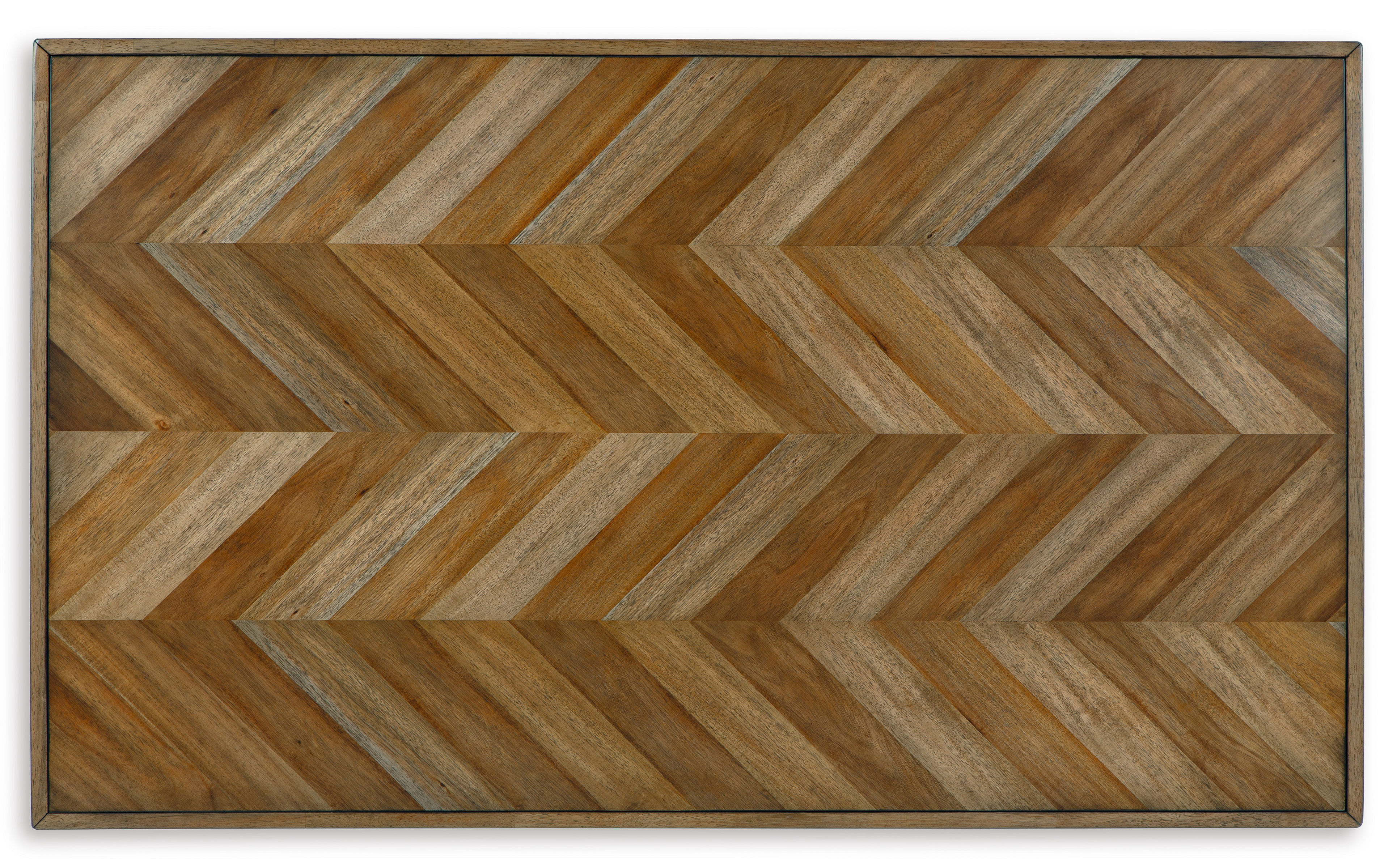 • Inlay tabletop with plank effect in chevron pattern; black tapered legs