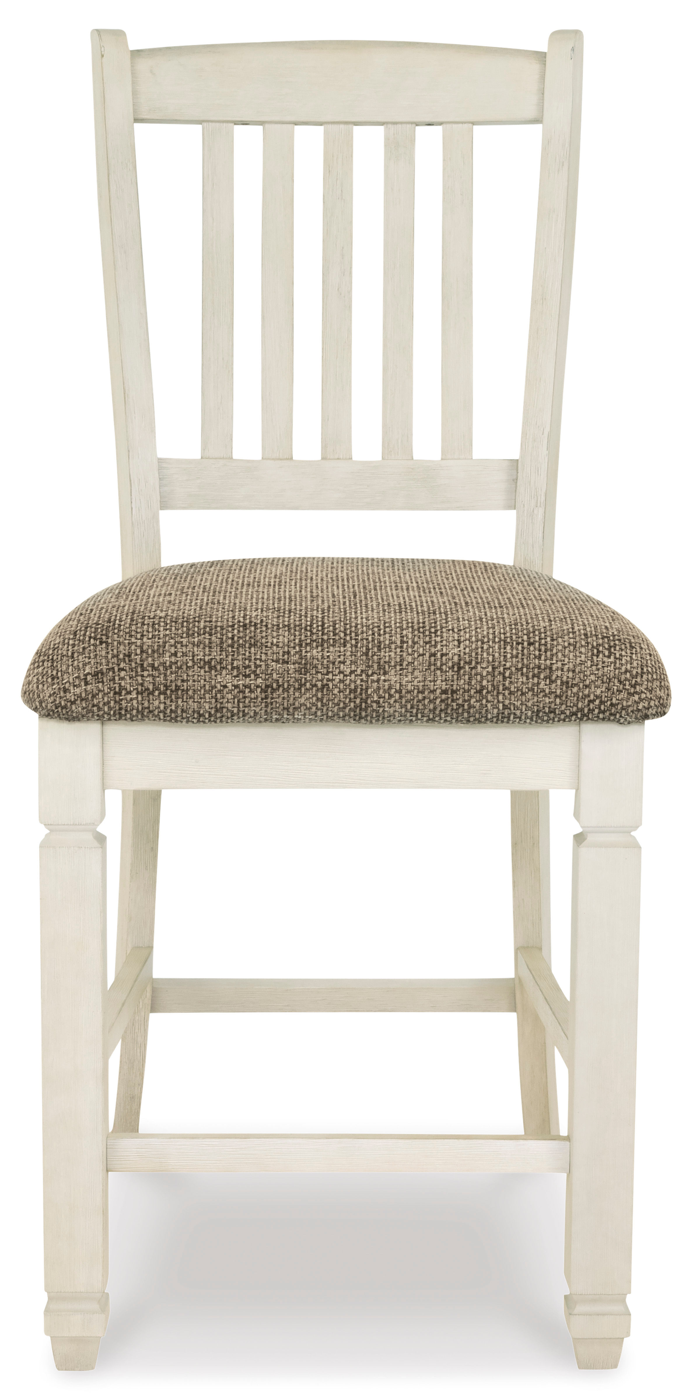 The beauty of the Bolanburg upholstered bar stool is something to savor. Designed to serve up comfort and flair, this rake-back bar stool entices with a cushioned seat covered in a heavy woven fabric that complements the antiqued white finish.