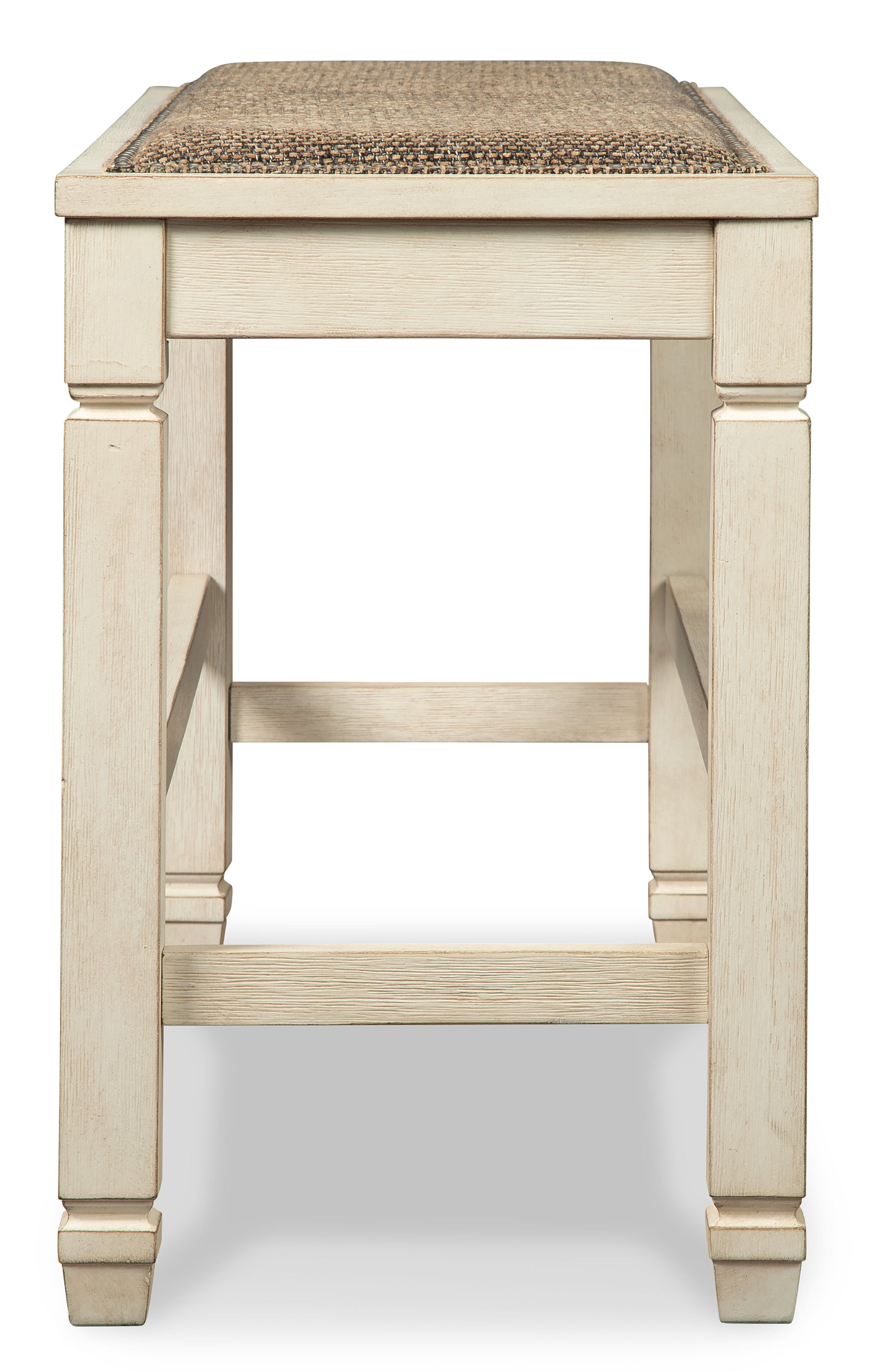 The beauty of the Bolanburg upholstered dining bench is something to savor. Serving up comfort and flair, this generously scaled counter-height bench entices with a cushioned seat covered in a heavy woven fabric that complements the antiqued white finish.
