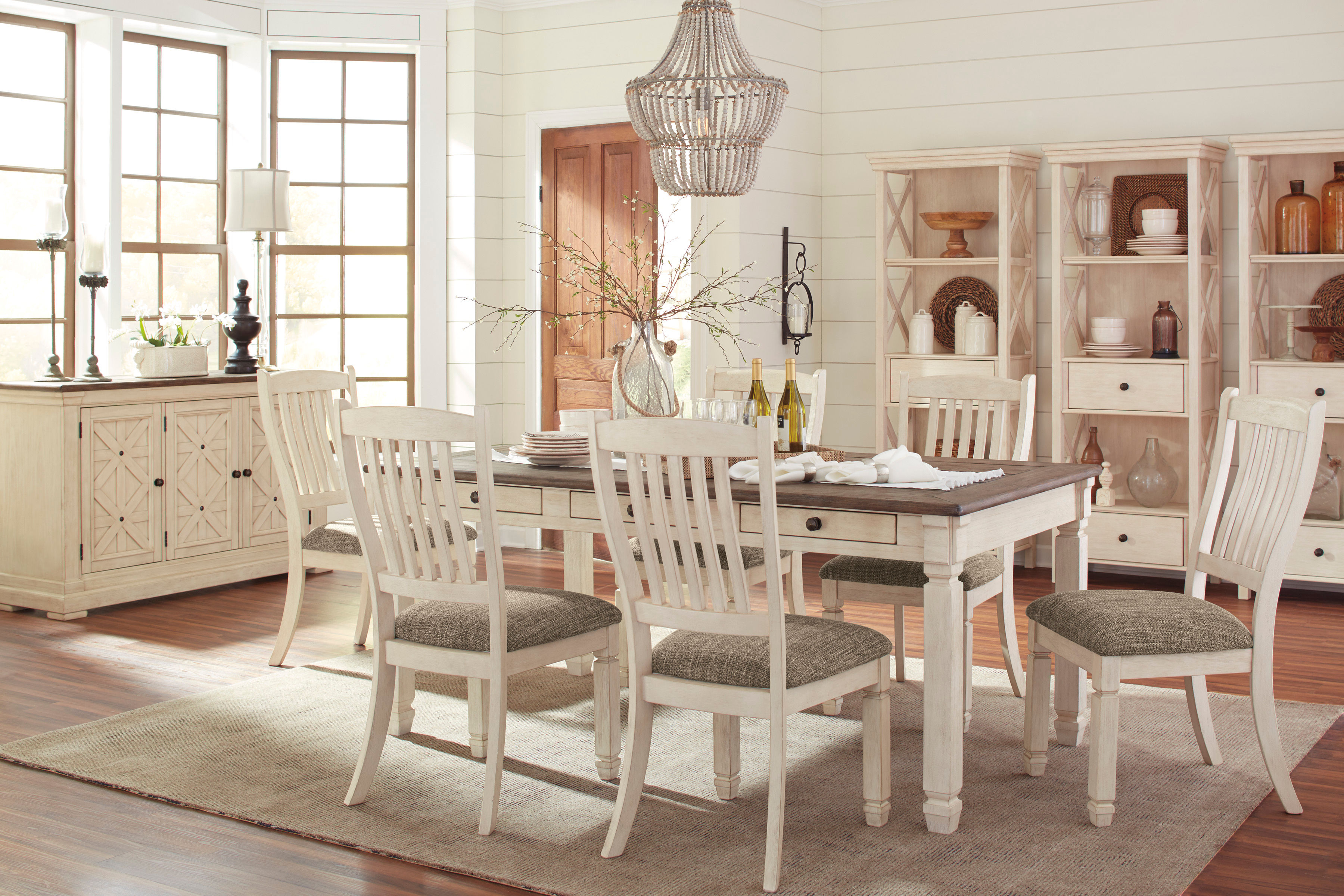 The beauty of the Bolanburg upholstered dining chair is something to savor. Designed to serve up comfort and flair, this rake-back dining chair entices with a cushioned seat covered in a heavy woven fabric that complements the chair’s antiqued white finish.
