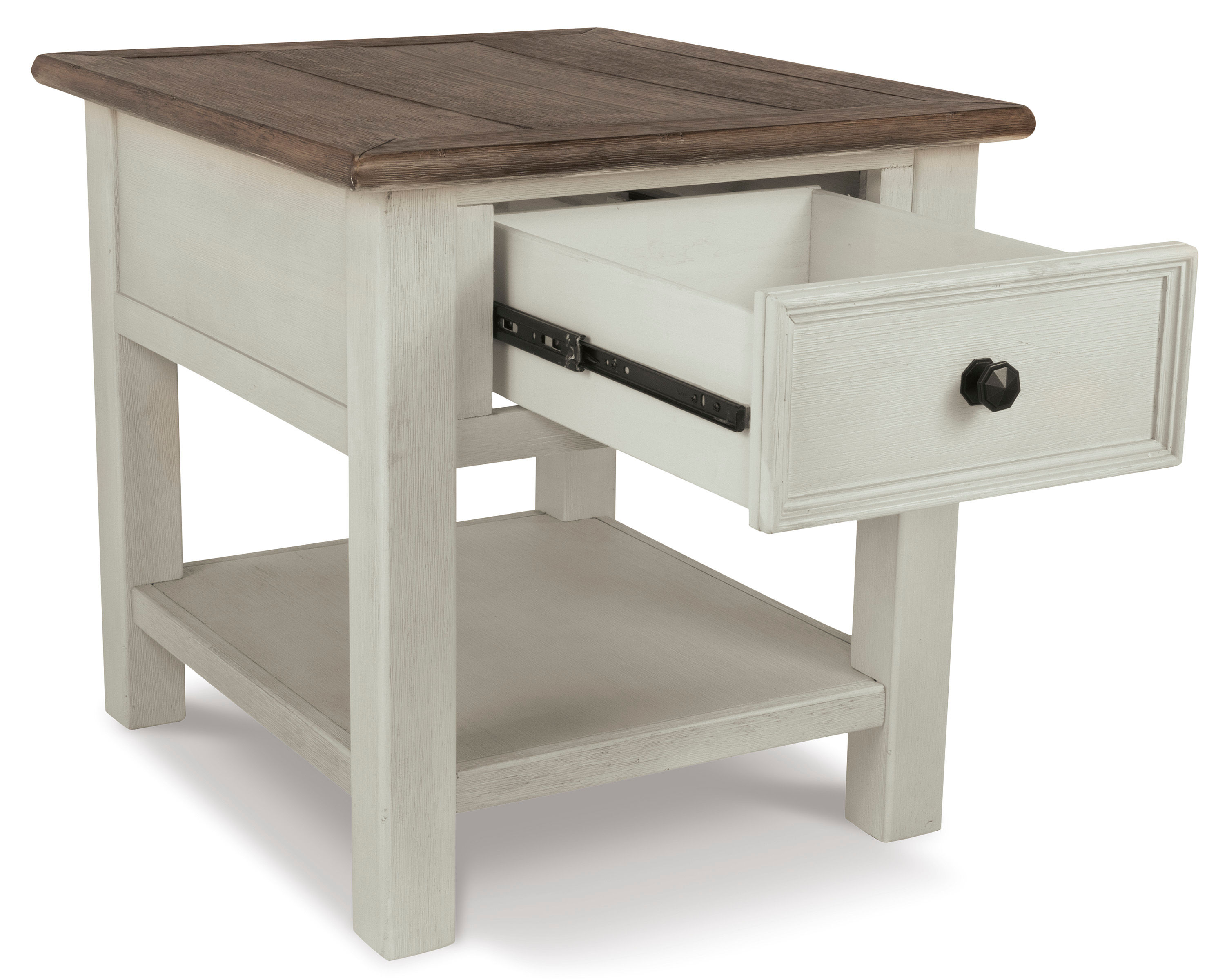 This farmhouse style end table has charming details, a two-tone finish, and a smooth-gliding drawer.