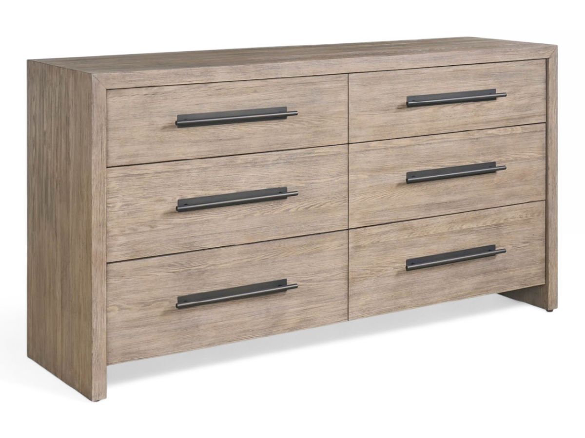 Crafted in a warm Boulder medium-brown finish, the Six Drawer Dresser blends natural texture with clean, modern lines. Its framed drawer fronts and sleek hardware create a sophisticated storage solution, perfect for adding both functionality and a touch of architectural detail to your bedroom.