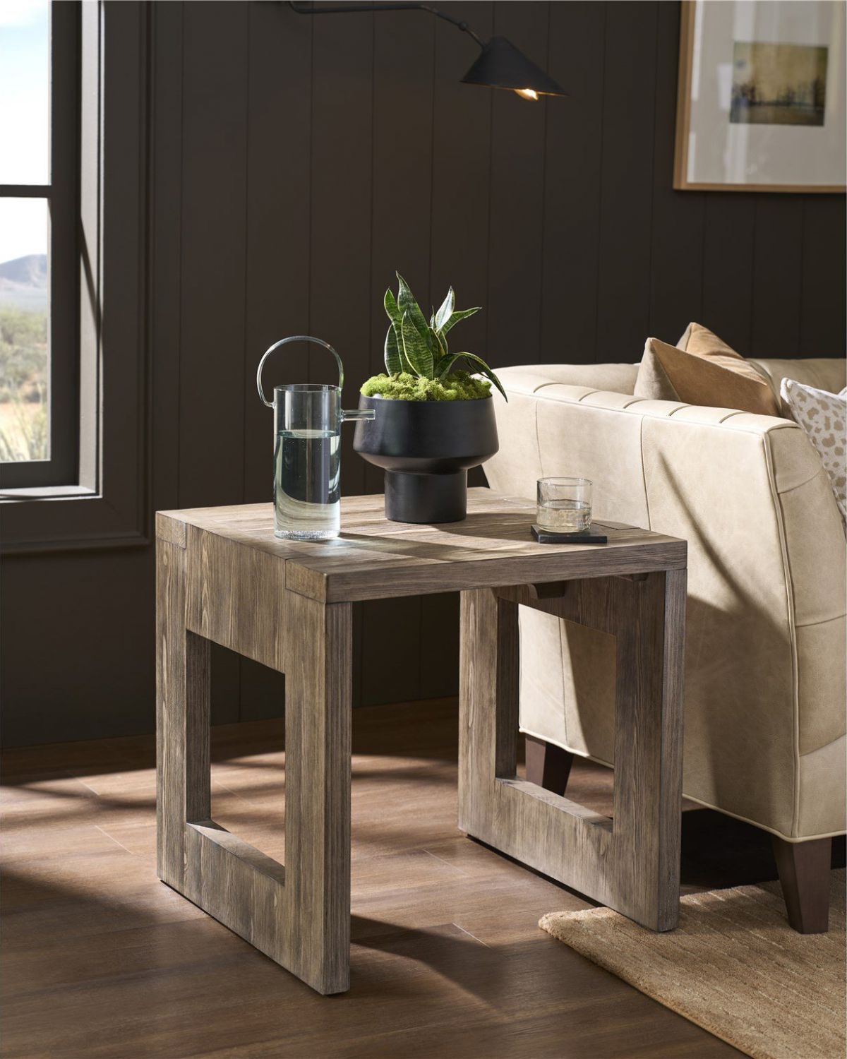 The Boulder End Table features a clean, architectural design with its open frame and sleek silhouette. Finished in a warm Boulder medium-brown, this table adds a touch of modern sophistication to any living space. Its minimalist form and natural wood grain create a versatile piece that complements a variety of décor styles.