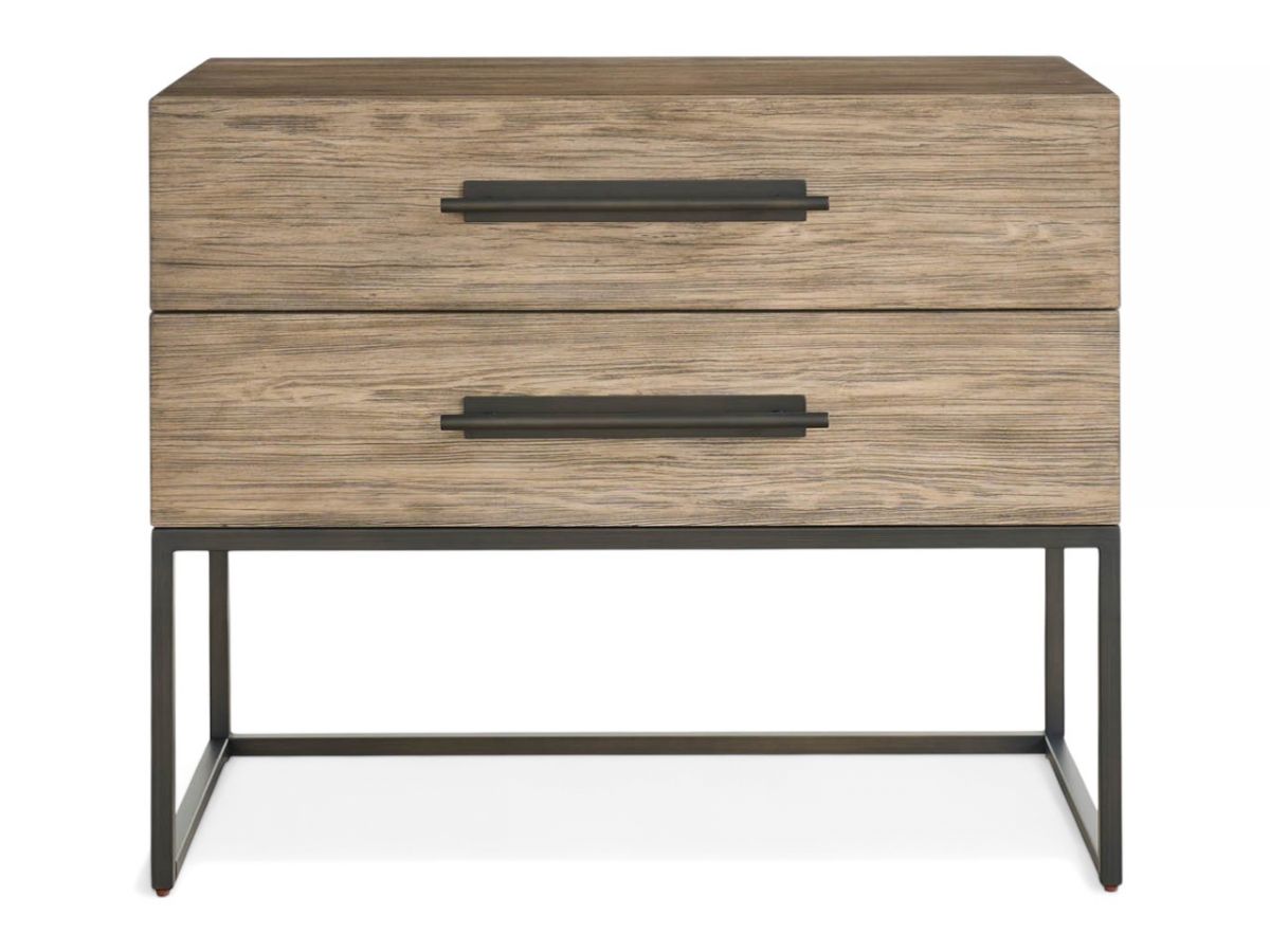 The Boulder Metal Base Nightstand combines industrial flair with natural warmth. Featuring a sleek metal base and a warm Boulder medium-brown finish, its clean lines and two spacious drawers offer both style and functionality. This nightstand adds a modern, architectural touch to your bedside, perfect for those seeking a blend of contemporary design and practical storage.