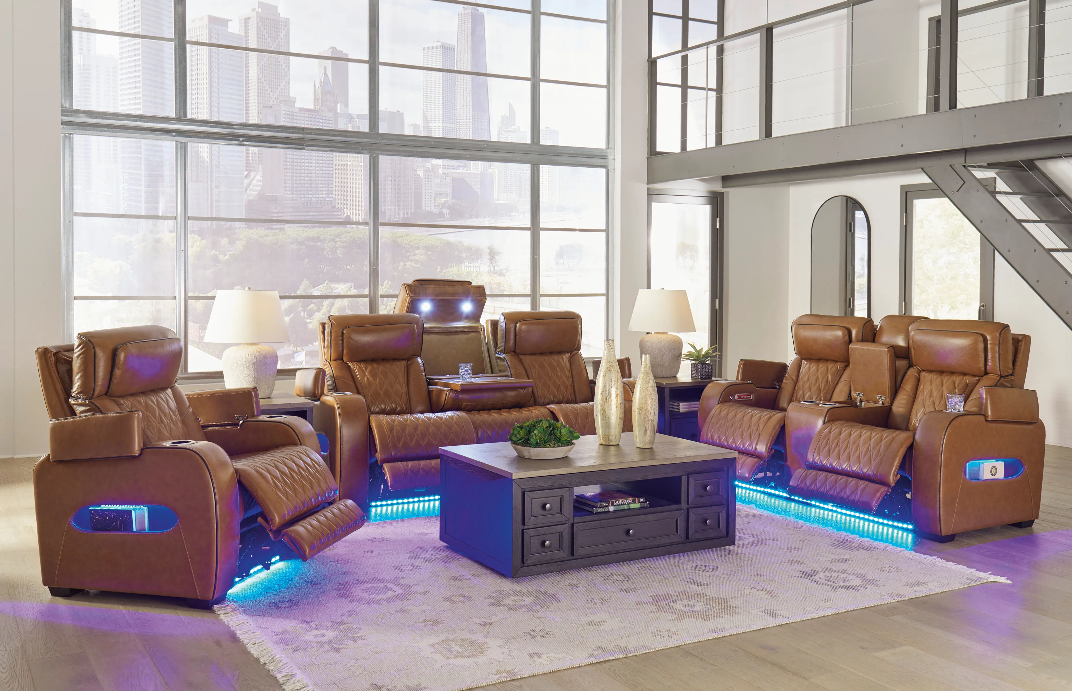 • Ambient blue LED lighting for a theater-style experience