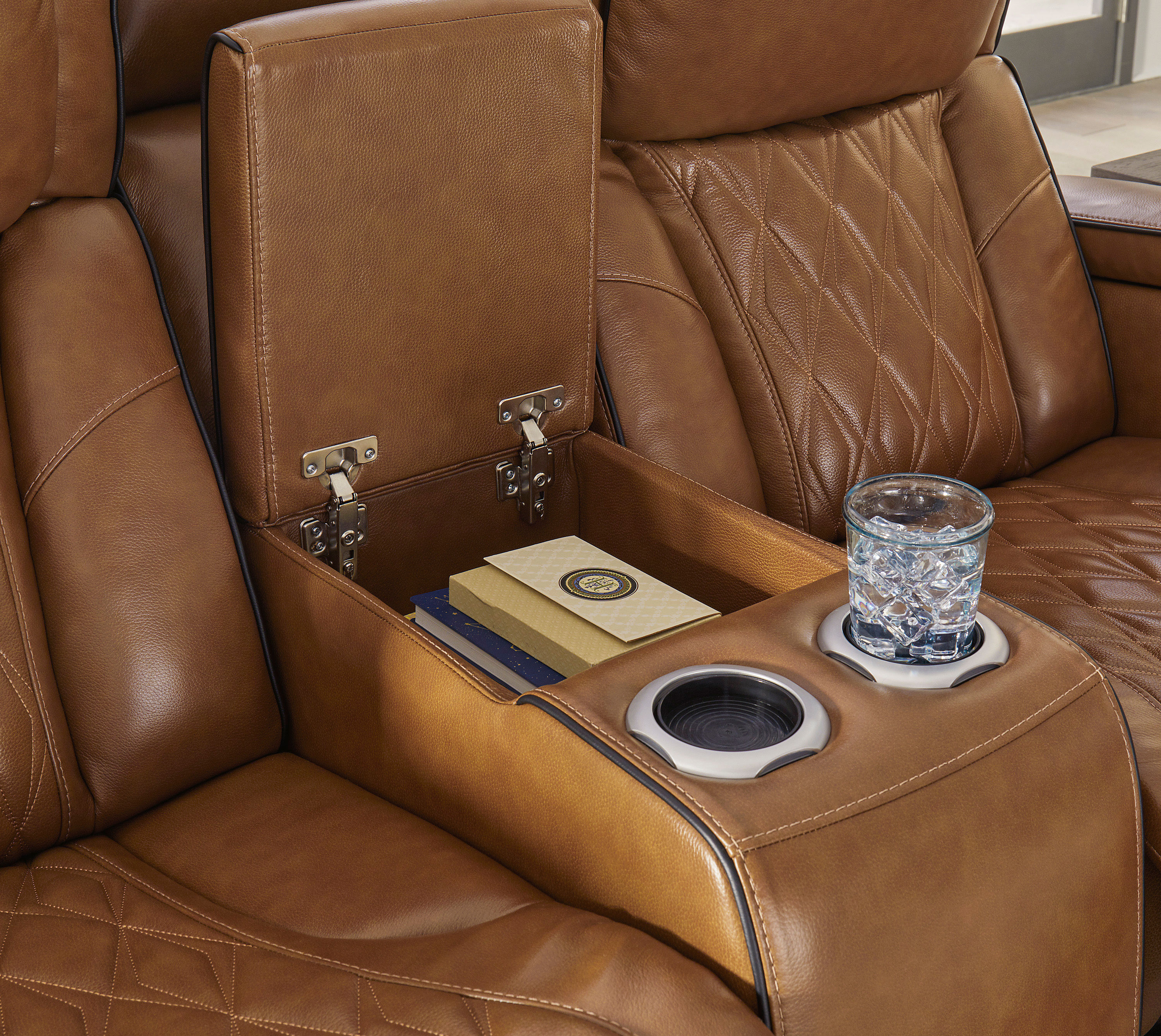 • Center console with 2 cup holders and hidden storage; armrests with flip-top storage and cup holder